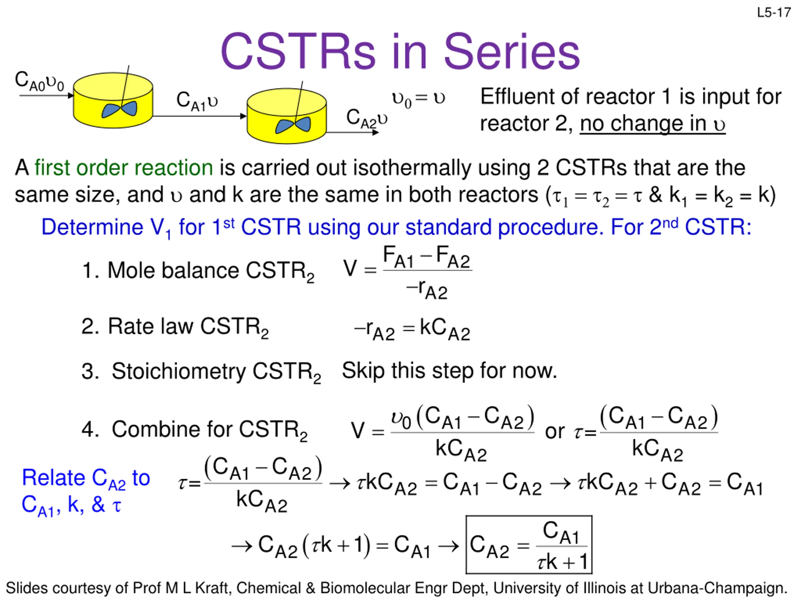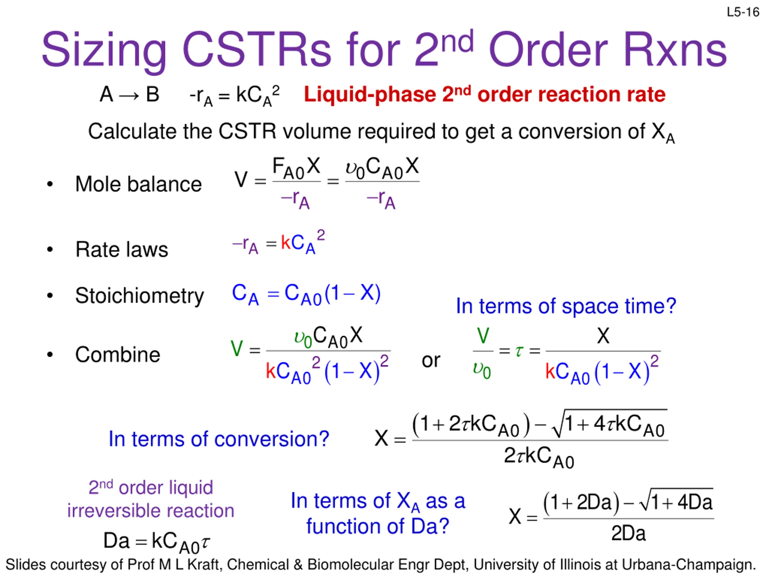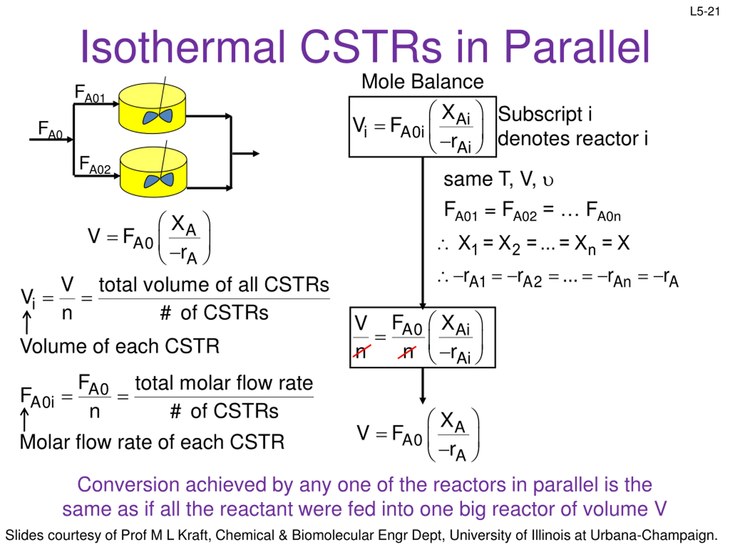 L5-20 n CSTRs in Series CA0 0 CA1 = CA2 1st order irreversible liquid-phase rxn run in n CSTRs with identical V, and k C + A0 = C For n identical CSTRs, then: An n ( ) 1 k Rate of disappearance of A in the nth reactor: C + A0 An r = = kC k An n ( ) 1 k How is conversion related to the # of CSTRs in series? C Put CAn in terms of XAn (XA at the last CSTR): 1 ( ) A0 1 X = = C 1 X An A0 An n n ( ) ( ) + + 1 k 1 k 1 1st order irreversible liquid phase rxn run in n CSTRs with identical V, and k 1 1 = = X or 1 X An An n n ( ) ( ) + + 1 k 1 Da Slides courtesy of Prof M L Kraft, Chemical & Biomolecular Engr Dept, University of Illinois at Urbana-Champaign.