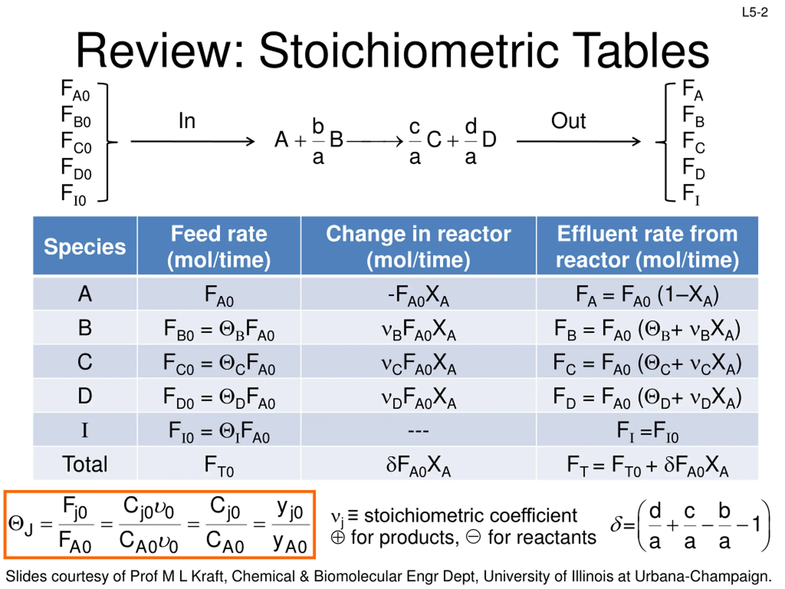 L5-2 Review: Stoichiometric Tables FA0 FB0 FC0 FD0 FI0 FA FB FC FD FI In Out b c d + + A B a C D a a Feed rate (mol/time) FA0 FB0 = FA0 FC0 = CFA0 FD0 = DFA0 FI0 = IFA0 FT0 Change in reactor (mol/time) -FA0XA BFA0XA CFA0XA DFA0XA --- FA0XA Effluent rate from reactor (mol/time) FA = FA0 (1 XA) FB = FA0 ( + BXA) FC = FA0 ( C+ CXA) FD = FA0 ( D+ DXA) FI=FI0 FT = FT0 + FA0XA Species A B C D I Total F F C C C C y y d a c a b a j0 j0 0 j0 j0 j stoichiometric coefficient for products, for reactants = = = = + = 1 J A0 A0 0 A0 A0 Slides courtesy of Prof M L Kraft, Chemical & Biomolecular Engr Dept, University of Illinois at Urbana-Champaign.