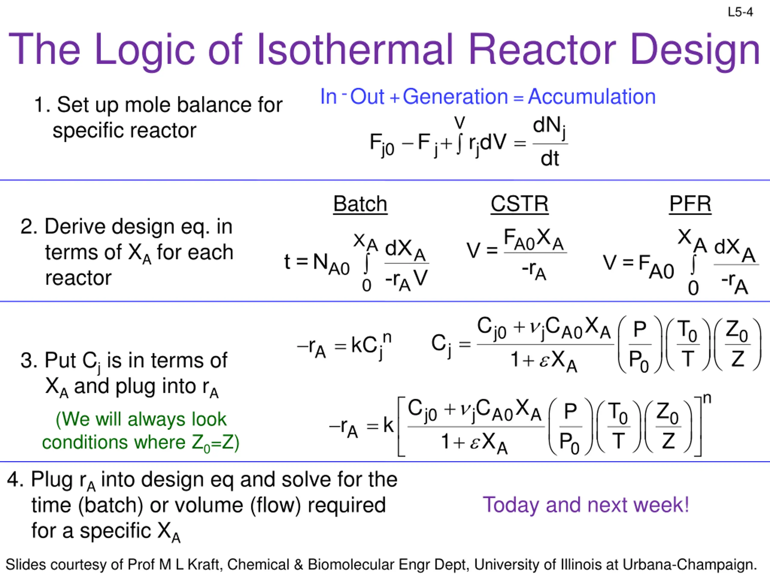 L5-4 The Logic of Isothermal Reactor Design In Out - 1. Set up mole balance for specific reactor +Generation =Accumulation dN dt V j + = F F rdV j0 j j Batch CSTR PFR 2. Derive design eq. in terms of XA for each reactor F X XA dXA 0 XA A0 -r A dX -r V V = A t =N V =FA0 0 A0 A -rA A + + C C X T T Z Z P P j0 A0 X j A 0 0 n j = C = r kC j A 1 3. Put Cj is in terms of XA and plug into rA (We will always look conditions where Z0=Z) A 0 n + + C C X T T Z Z P P j0 A0 X j A 0 0 = r k A 1 A 0 4. Plug rA into design eq and solve for the time (batch) or volume (flow) required for a specific XA Today and next week! Slides courtesy of Prof M L Kraft, Chemical & Biomolecular Engr Dept, University of Illinois at Urbana-Champaign.