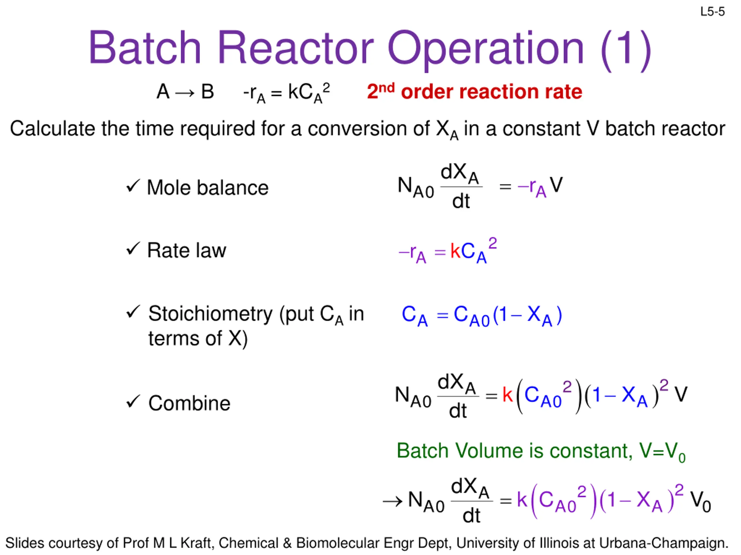 L5-5 Batch Reactor Operation (1) A B -rA = kCA2 2nd order reaction rate Calculate the time required for a conversion of XA in a constant V batch reactor dX dt A = r N V Mole balance A0 A 2 = Rate law Ar kC A = (1 X ) Stoichiometry (put CA in terms of X) C C A A0 A ( )( d X 2 ) 2 A = N k C 1 X V Combine A0 A 0 A dt Batch Volume is constant, V=V0 ( A0 dt )( d X )2 2 A = N k C 1 X V A0 A 0 Slides courtesy of Prof M L Kraft, Chemical & Biomolecular Engr Dept, University of Illinois at Urbana-Champaign.
