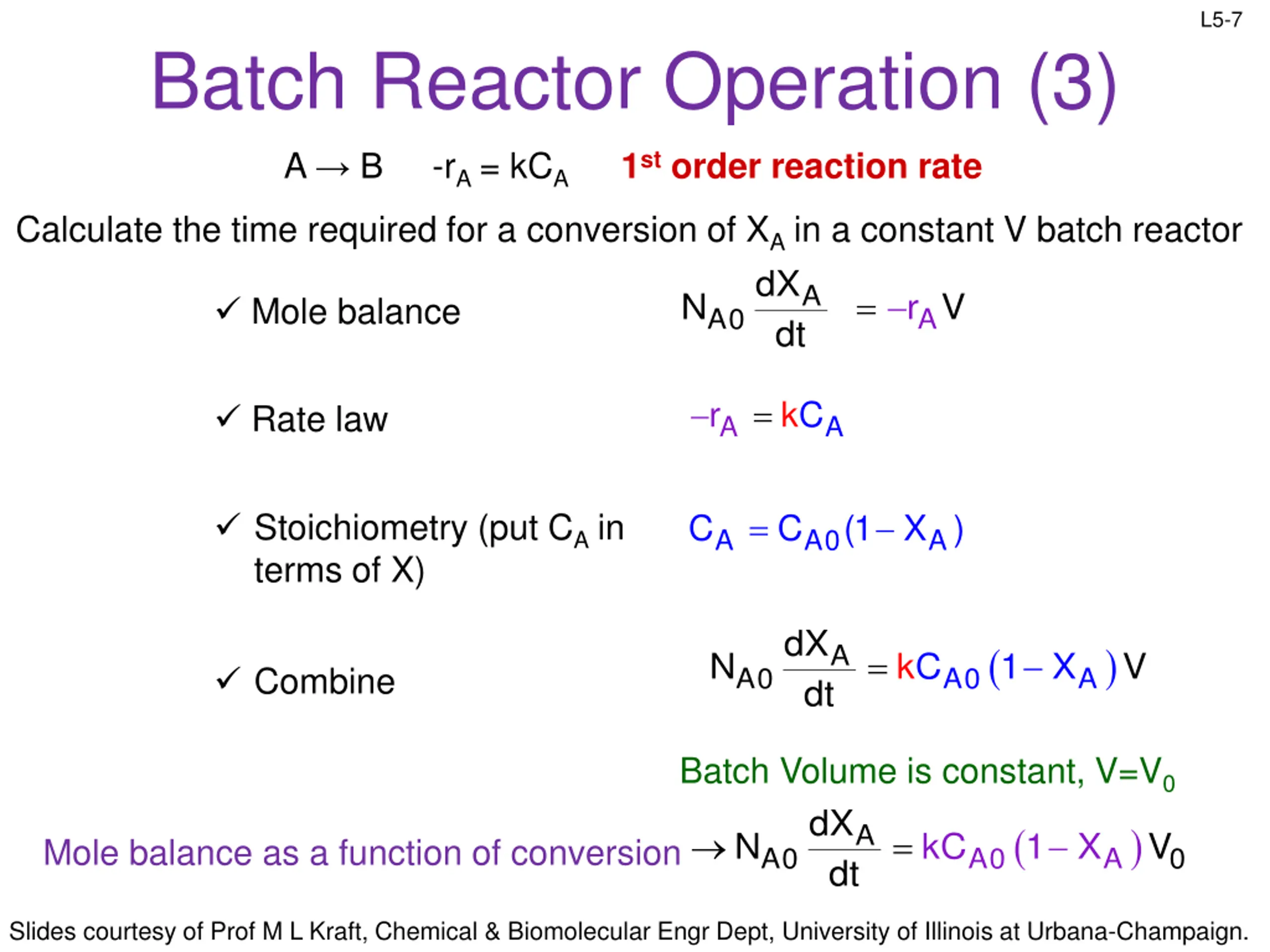L5-7 Batch Reactor Operation (3) A B -rA = kCA 1st order reaction rate Calculate the time required for a conversion of XA in a constant V batch reactor dX dt A = r N V Mole balance A0 A = r k C Rate law A A = (1 X ) Stoichiometry (put CA in terms of X) C C A A0 A dX dt ( ) A = N k C 1 X V Combine A0 A 0 A Batch Volume is constant, V=V0 dX N dt ( ) A = kC 1 X V Mole balance as a function of conversion A0 A 0 A 0 Slides courtesy of Prof M L Kraft, Chemical & Biomolecular Engr Dept, University of Illinois at Urbana-Champaign.