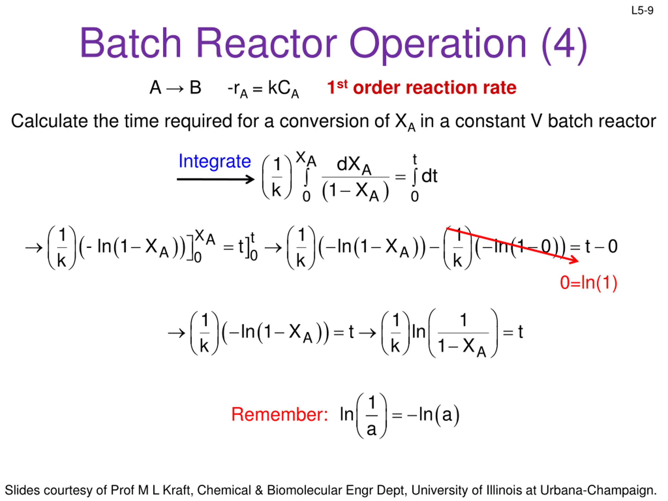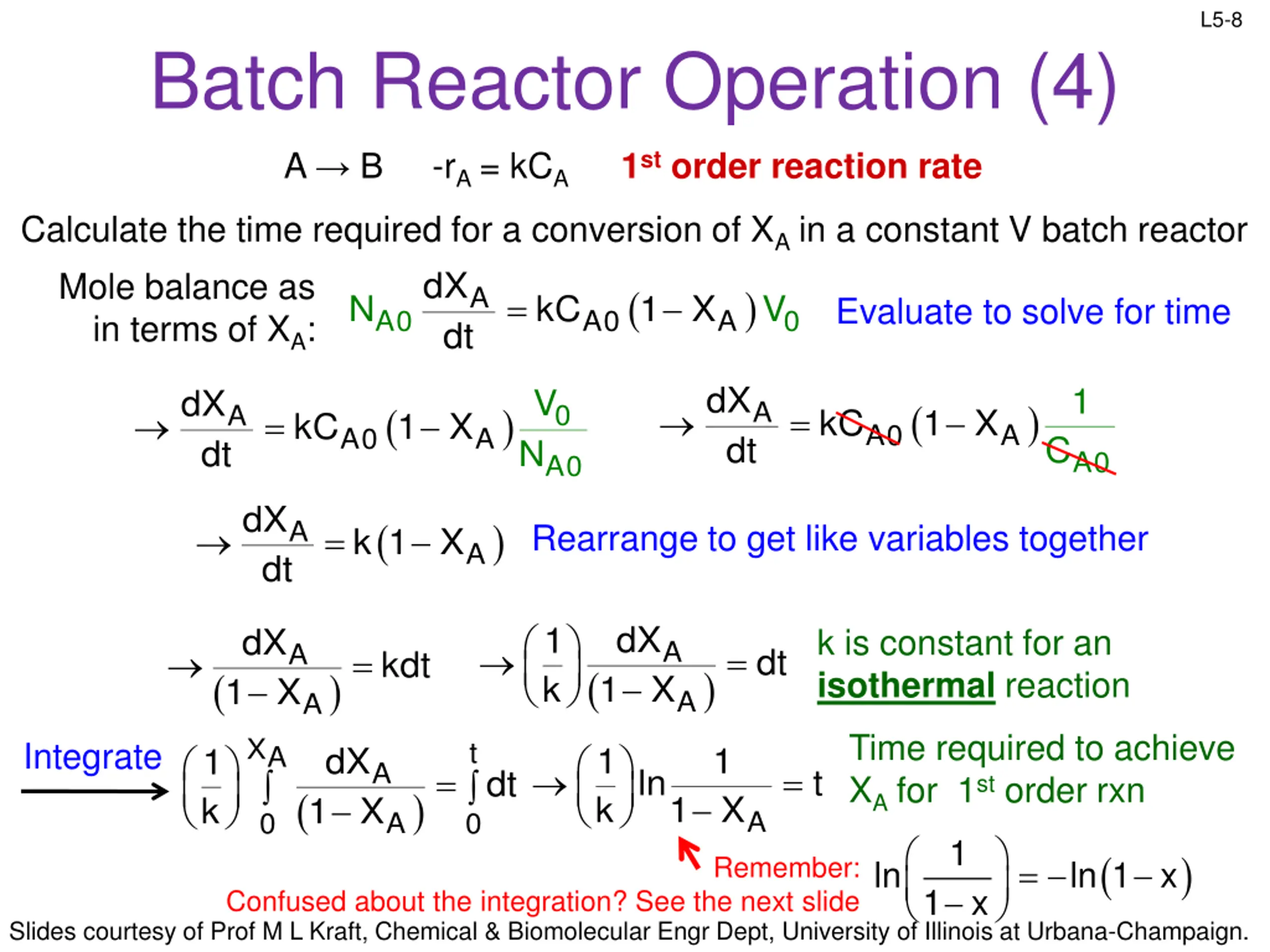 L5-8 Batch Reactor Operation (4) A B -rA = kCA 1st order reaction rate Calculate the time required for a conversion of XA in a constant V batch reactor dX kC N t d in terms of XA: Mole balance as ( ) A = 1 X V Evaluate to solve for time A 0 A0 A 0 dX d 1 V dX dt ( ) A t ( ) 0 A = kC 1 X = kC 1 X A0 A A0 A C N A0 A0 dX dt ( ) A Rearrange to get like variables together = k 1 X A dX 1 X 1 k dX 1 X k is constant for an isothermal reaction A A = dt = kdt ( ) ( ) A A Time required to achieve XA for 1st order rxn 1 ln 1 x X Integrate t 1 k 1 dX 1 X A 1 k A = = ln t dt ( ) 1 X A A 0 0 = ( ) Remember: ln 1 x Confused about the integration? See the next slide Slides courtesy of Prof M L Kraft, Chemical & Biomolecular Engr Dept, University of Illinois at Urbana-Champaign.