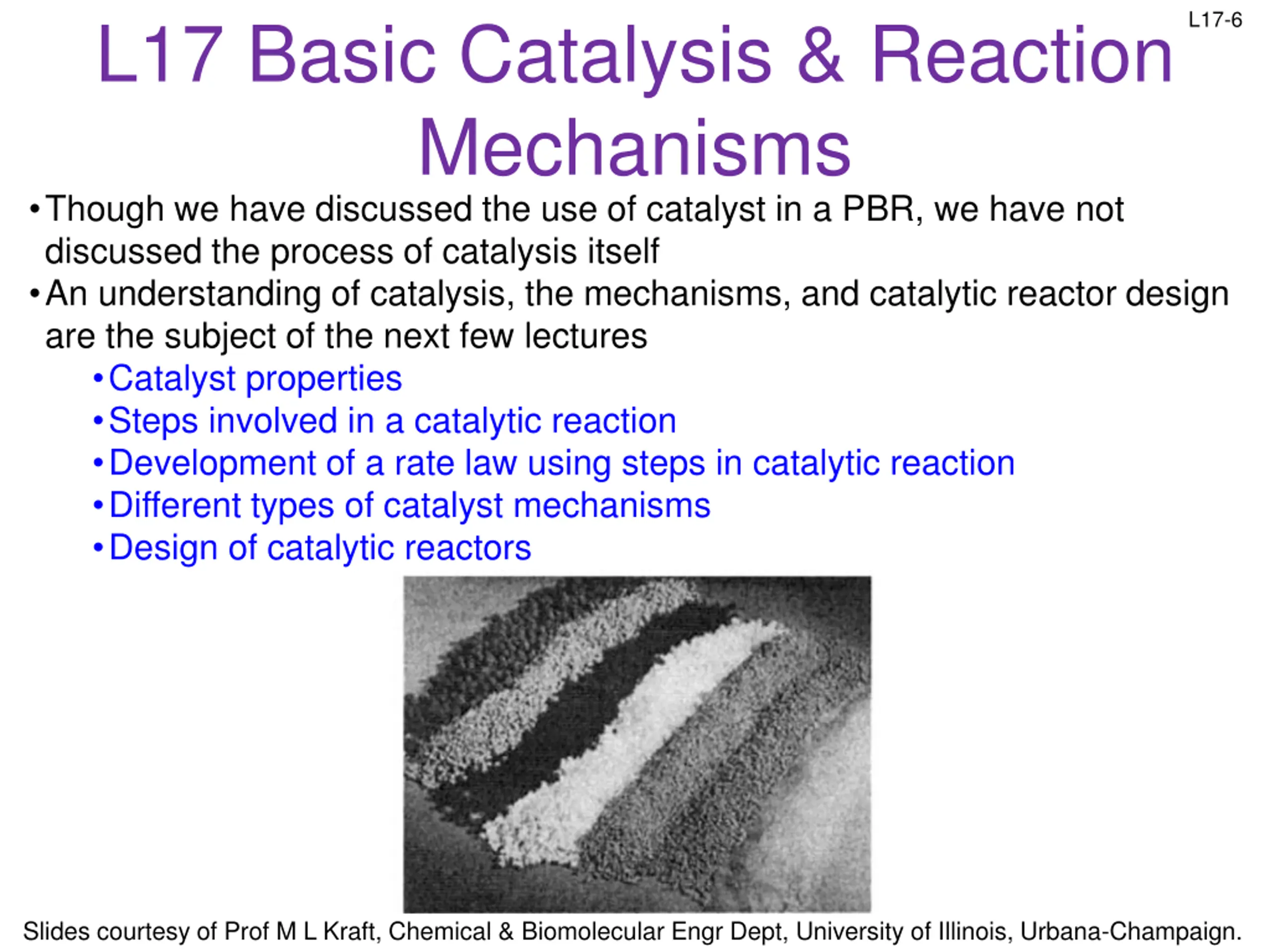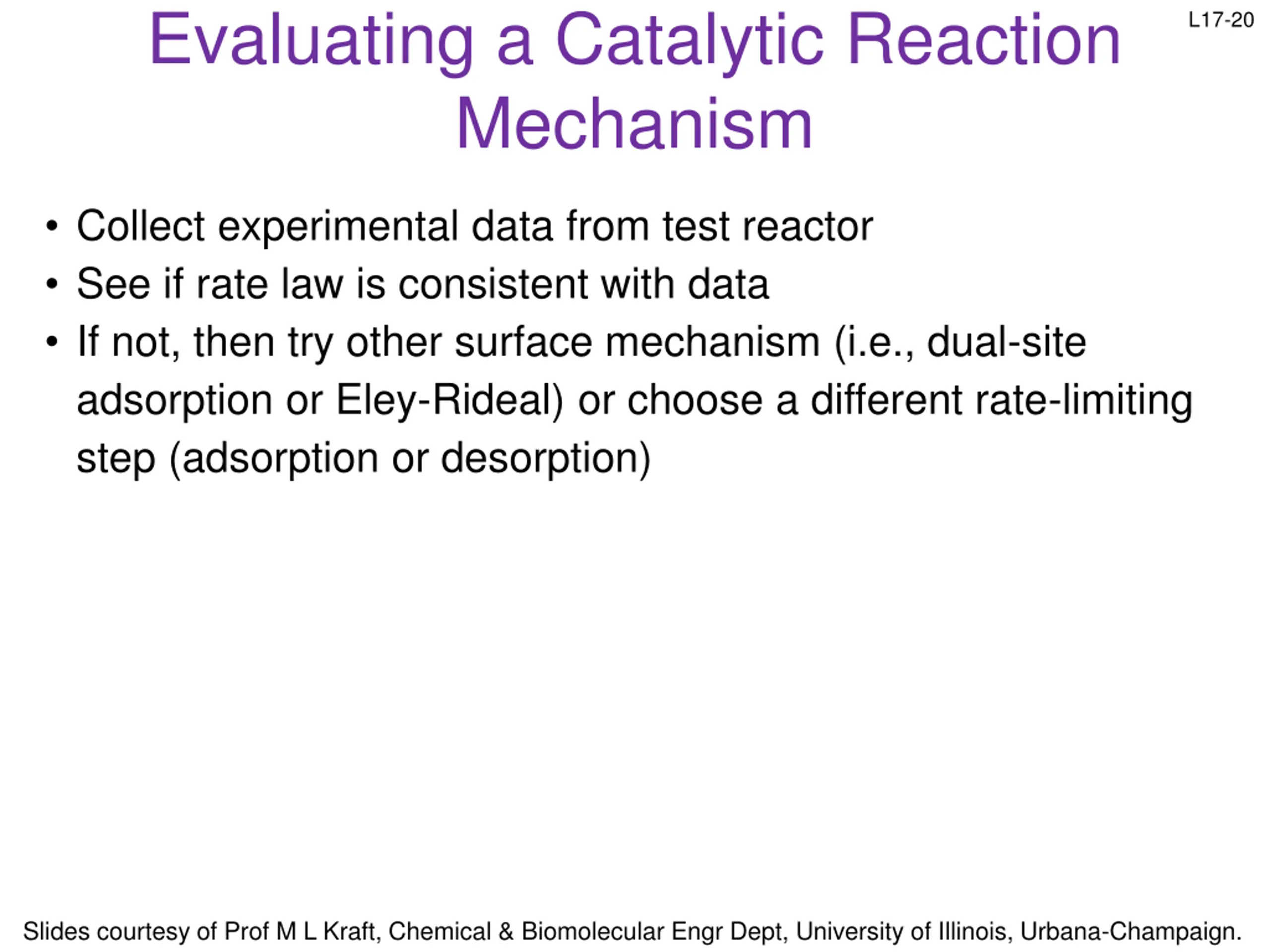 Evaluating a Catalytic Reaction Mechanism L17-20 Collect experimental data from test reactor See if rate law is consistent with data If not, then try other surface mechanism (i.e., dual-site adsorption or Eley-Rideal) or choose a different rate-limiting step (adsorption or desorption) Slides courtesy of Prof M L Kraft, Chemical & Biomolecular Engr Dept, University of Illinois, Urbana-Champaign.