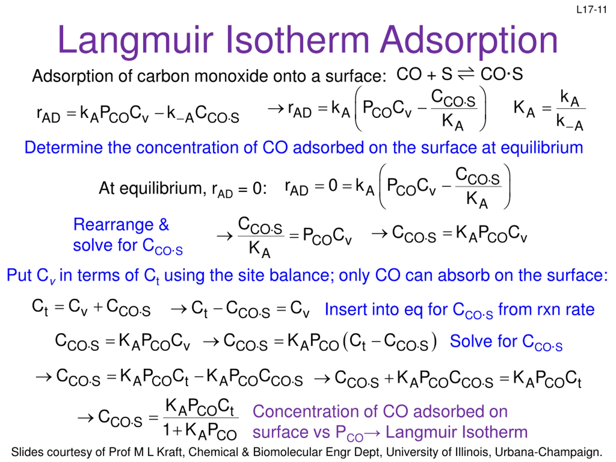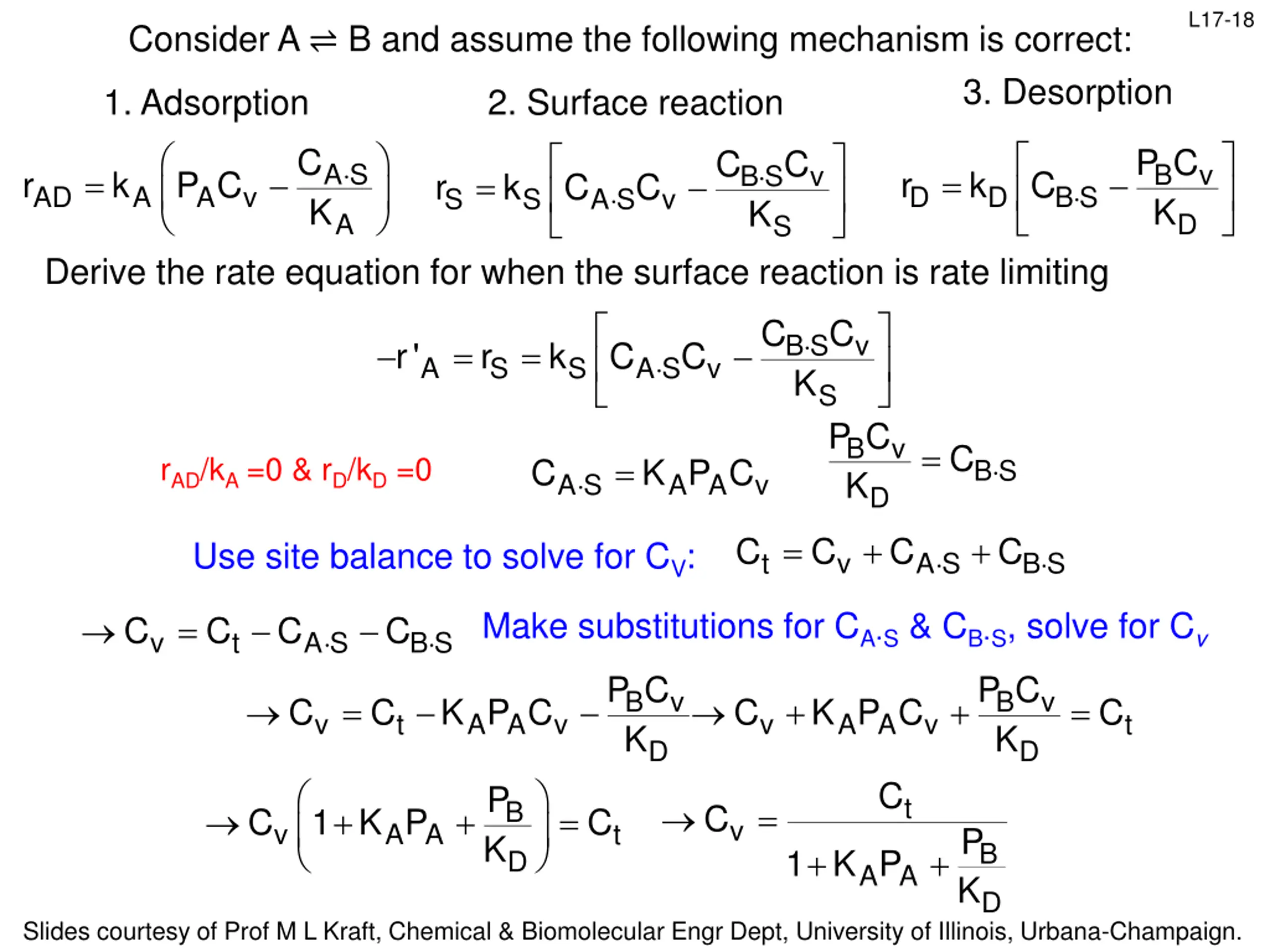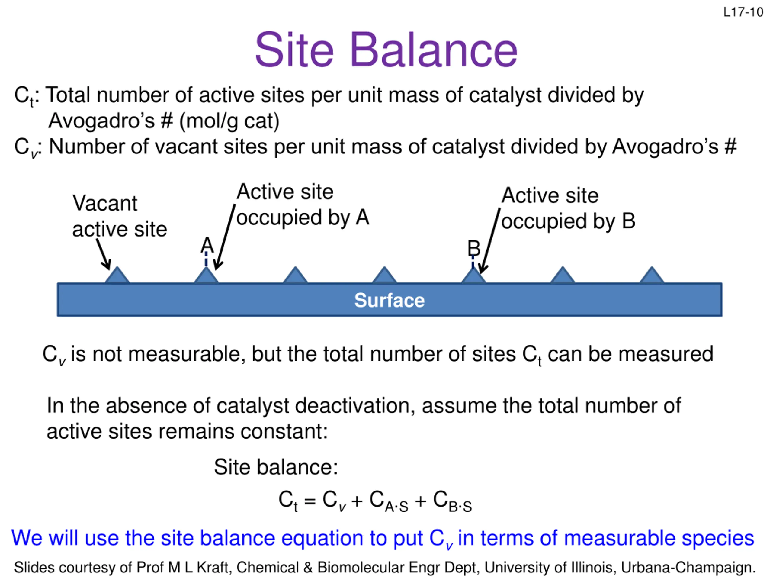 L17-10 Site Balance Ct: Total number of active sites per unit mass of catalyst divided by Avogadro s # (mol/g cat) Cv: Number of vacant sites per unit mass of catalyst divided by Avogadro s # Active site occupied by A Active site occupied by B Vacant active site A B Surface Cv is not measurable, but the total number of sites Ct can be measured In the absence of catalyst deactivation, assume the total number of active sites remains constant: Site balance: Ct = Cv + CA S + CB S We will use the site balance equation to put Cv in terms of measurable species Slides courtesy of Prof M L Kraft, Chemical & Biomolecular Engr Dept, University of Illinois, Urbana-Champaign.