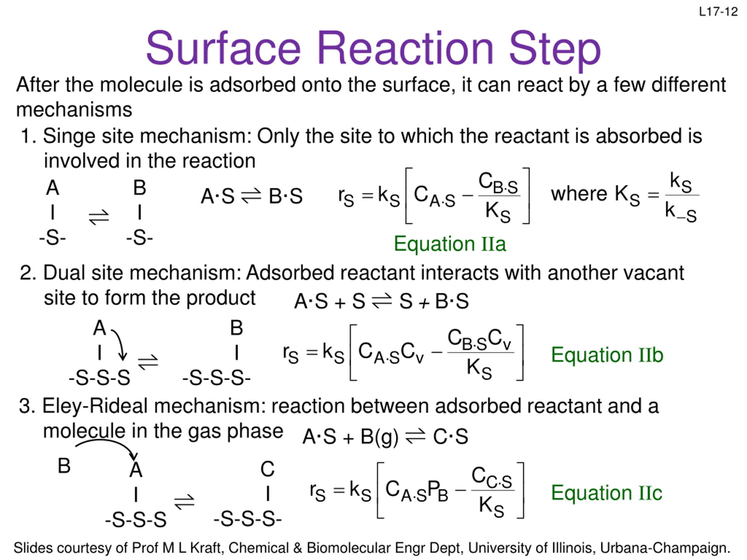 L17-12 Surface Reaction Step After the molecule is adsorbed onto the surface, it can react by a few different mechanisms 1. Singe site mechanism: Only the site to which the reactant is absorbed is involved in the reaction A I -S- -S- k k C B I S B S K = = where K S r k C A S B S A S S S S S Equation IIa 2. Dual site mechanism: Adsorbed reactant interacts with another vacant site to form the product A I -S-S-S -S-S-S- 3. Eley-Rideal mechanism: reaction between adsorbed reactant and a molecule in the gas phase A S + B(g) C S A I -S-S-S A S + S S+ B S = B C C B S K v S r k C C I Equation IIb A S S v S B C C CS K = S r k C P Equation IIc I -S-S-S- A S B S S Slides courtesy of Prof M L Kraft, Chemical & Biomolecular Engr Dept, University of Illinois, Urbana-Champaign.