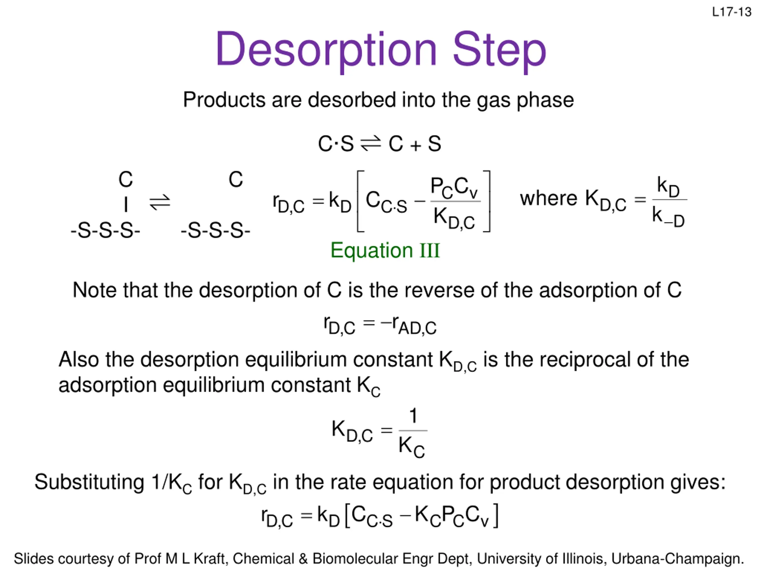 L17-13 Desorption Step Products are desorbed into the gas phase C S C + S = Equation III C C k k P C K D C v = where K D,C r k C I -S-S-S- -S-S-S- D,C CS D D D,C Note that the desorption of C is the reverse of the adsorption of C r = AD,C r D,C Also the desorption equilibrium constant KD,C is the reciprocal of the adsorption equilibrium constant KC 1 = K D,C K C Substituting 1/KC for KD,C in the rate equation for product desorption gives: = D,C r k C C C K P C CS D v Slides courtesy of Prof M L Kraft, Chemical & Biomolecular Engr Dept, University of Illinois, Urbana-Champaign.