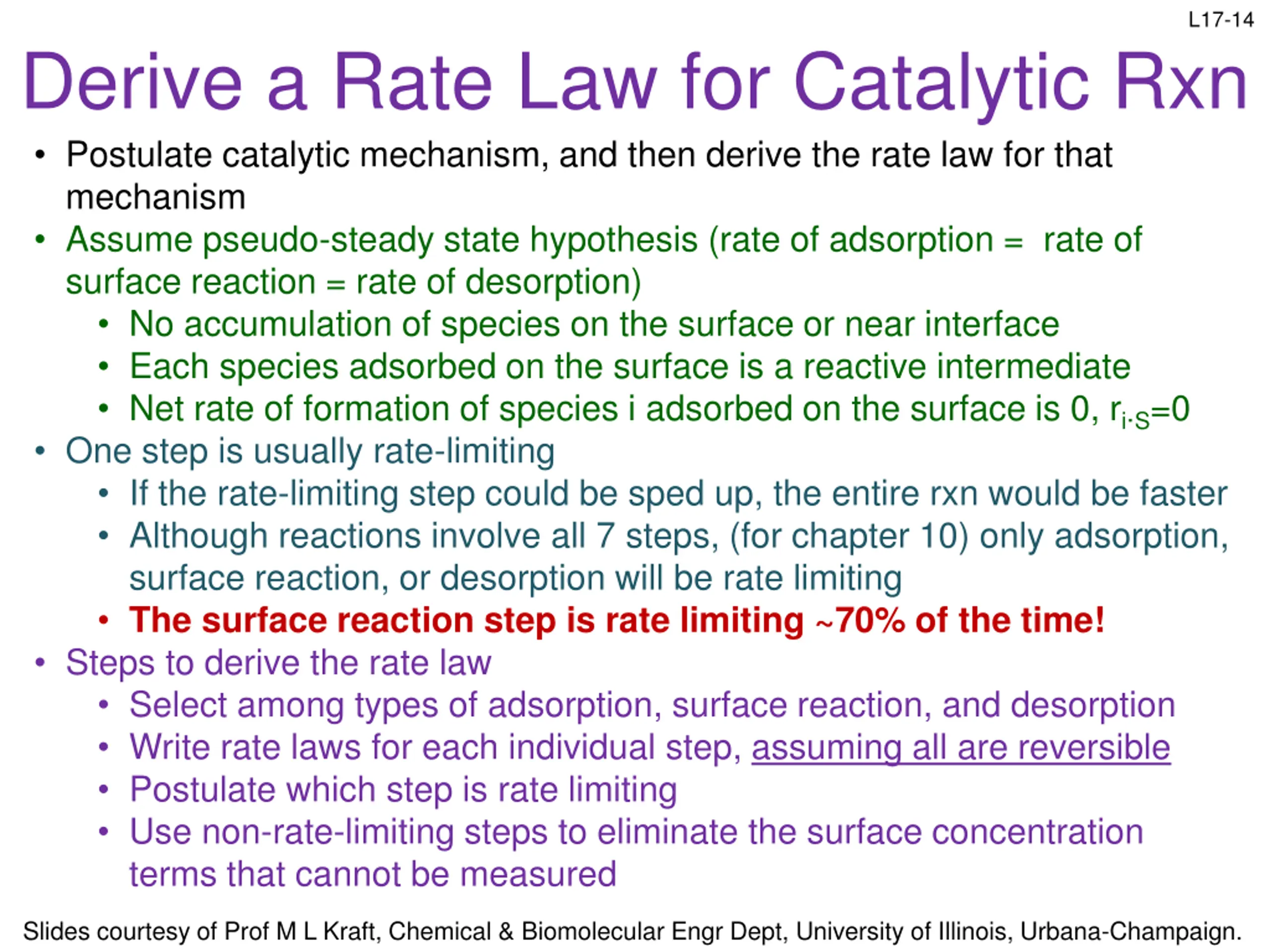 L17-14 Derive a Rate Law for Catalytic Rxn Postulate catalytic mechanism, and then derive the rate law for that mechanism Assume pseudo-steady state hypothesis (rate of adsorption = rate of surface reaction = rate of desorption) No accumulation of species on the surface or near interface Each species adsorbed on the surface is a reactive intermediate Net rate of formation of species i adsorbed on the surface is 0, ri S=0 One step is usually rate-limiting If the rate-limiting step could be sped up, the entire rxn would be faster Although reactions involve all 7 steps, (for chapter 10) only adsorption, surface reaction, or desorption will be rate limiting The surface reaction step is rate limiting ~70% of the time! Steps to derive the rate law Select among types of adsorption, surface reaction, and desorption Write rate laws for each individual step, assuming all are reversible Postulate which step is rate limiting Use non-rate-limiting steps to eliminate the surface concentration terms that cannot be measured Slides courtesy of Prof M L Kraft, Chemical & Biomolecular Engr Dept, University of Illinois, Urbana-Champaign.