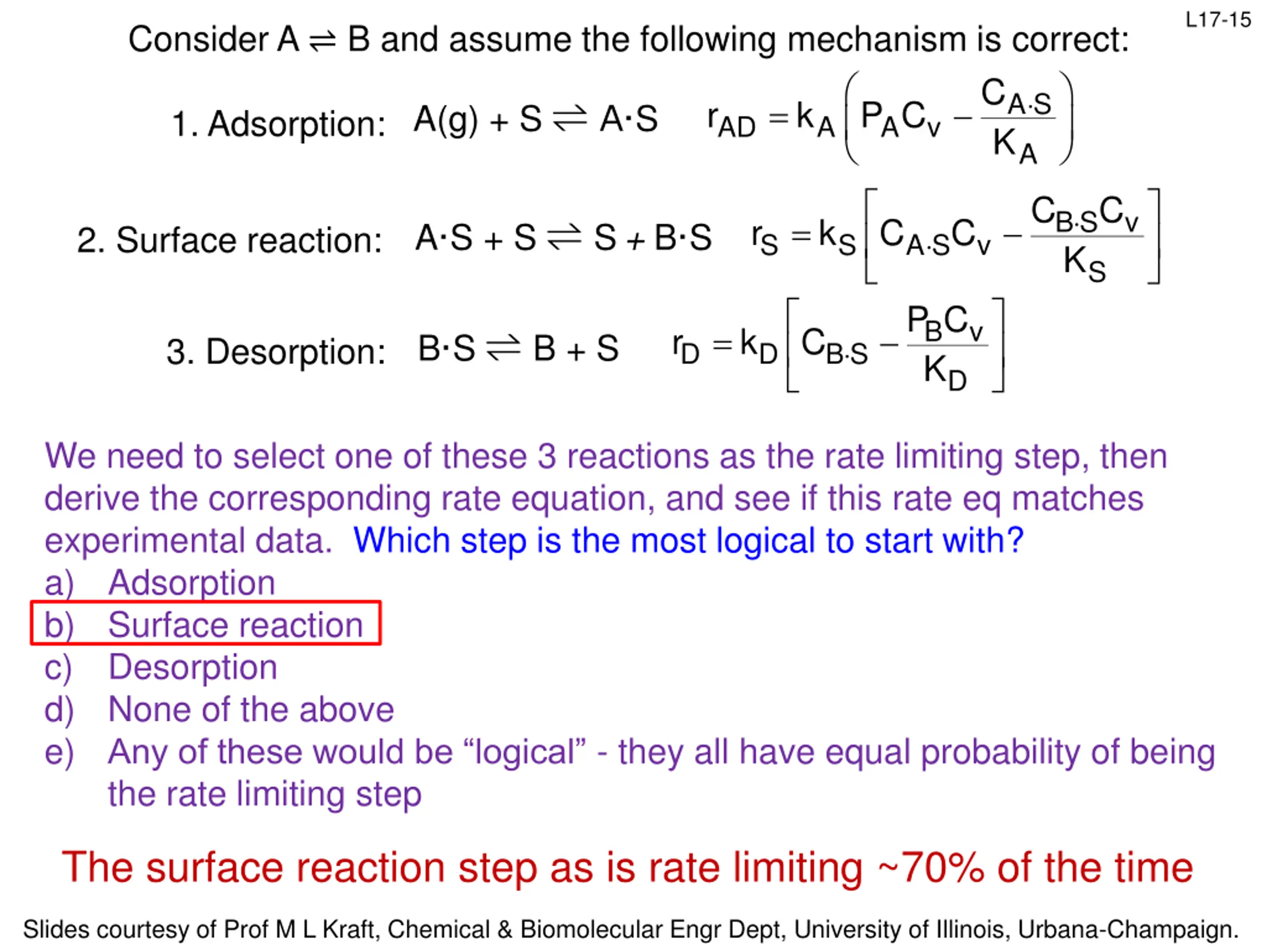 L17-15 Consider A B and assume the following mechanism is correct: C A S K = AD r k P C A(g) + S A S 1. Adsorption: A A v A C C B S K v = S r k C C A S + S S+ B S 2. Surface reaction: A S S v S P C B K v = D r k C B S B + S 3. Desorption: B S D D We need to select one of these 3 reactions as the rate limiting step, then derive the corresponding rate equation, and see if this rate eq matches experimental data. Which step is the most logical to start with? a) Adsorption b) Surface reaction c) Desorption d) None of the above e) Any of these would be logical - they all have equal probability of being the rate limiting step The surface reaction step as is rate limiting ~70% of the time Slides courtesy of Prof M L Kraft, Chemical & Biomolecular Engr Dept, University of Illinois, Urbana-Champaign.