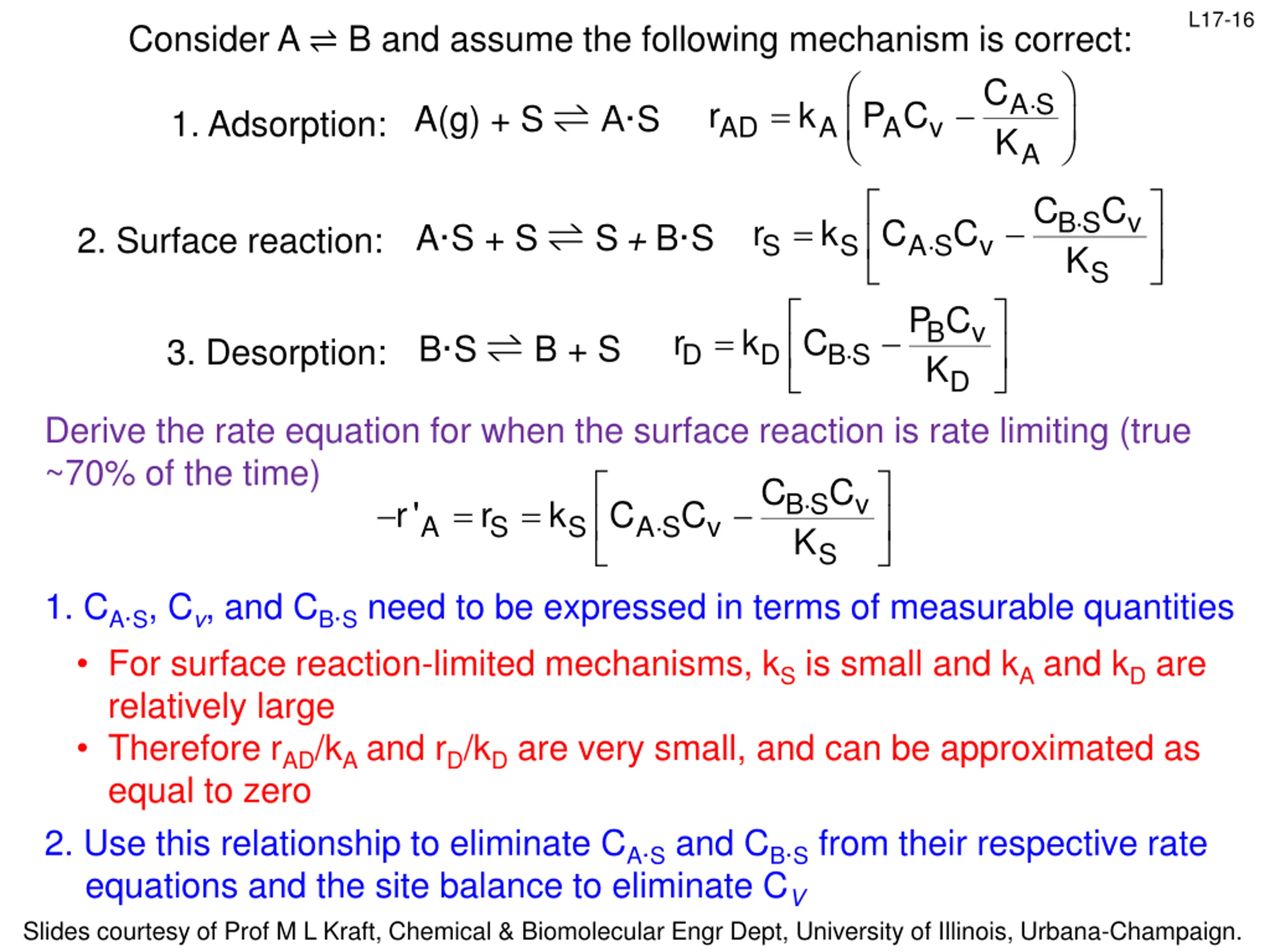 L17-16 Consider A B and assume the following mechanism is correct: C A S K = AD r k P C A(g) + S A S 1. Adsorption: A A v A C C B S K v = S r k C C A S + S S+ B S 2. Surface reaction: A S S v S P C B K v = D r k C B S B + S 3. Desorption: B S D D Derive the rate equation for when the surface reaction is rate limiting (true ~70% of the time) r' r k C = = 1. CA S, Cv, and CB S need to be expressed in terms of measurable quantities C C BS K v C A S A S S v S For surface reaction-limited mechanisms, kS is small and kA and kD are relatively large Therefore rAD/kA and rD/kD are very small, and can be approximated as equal to zero 2. Use this relationship to eliminate CA S and CB S from their respective rate equations and the site balance to eliminate CV Slides courtesy of Prof M L Kraft, Chemical & Biomolecular Engr Dept, University of Illinois, Urbana-Champaign.