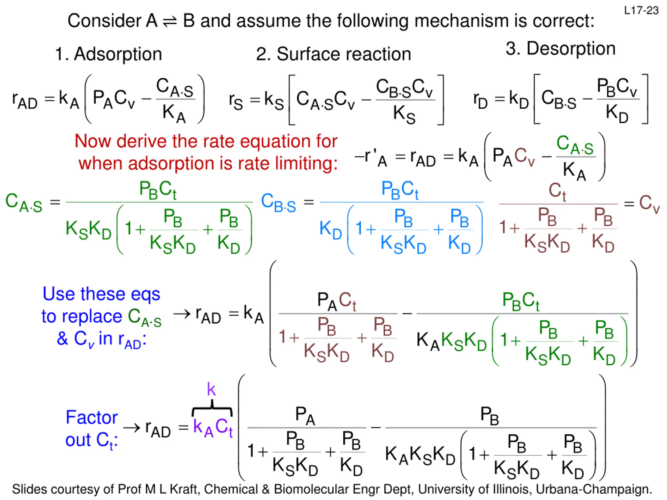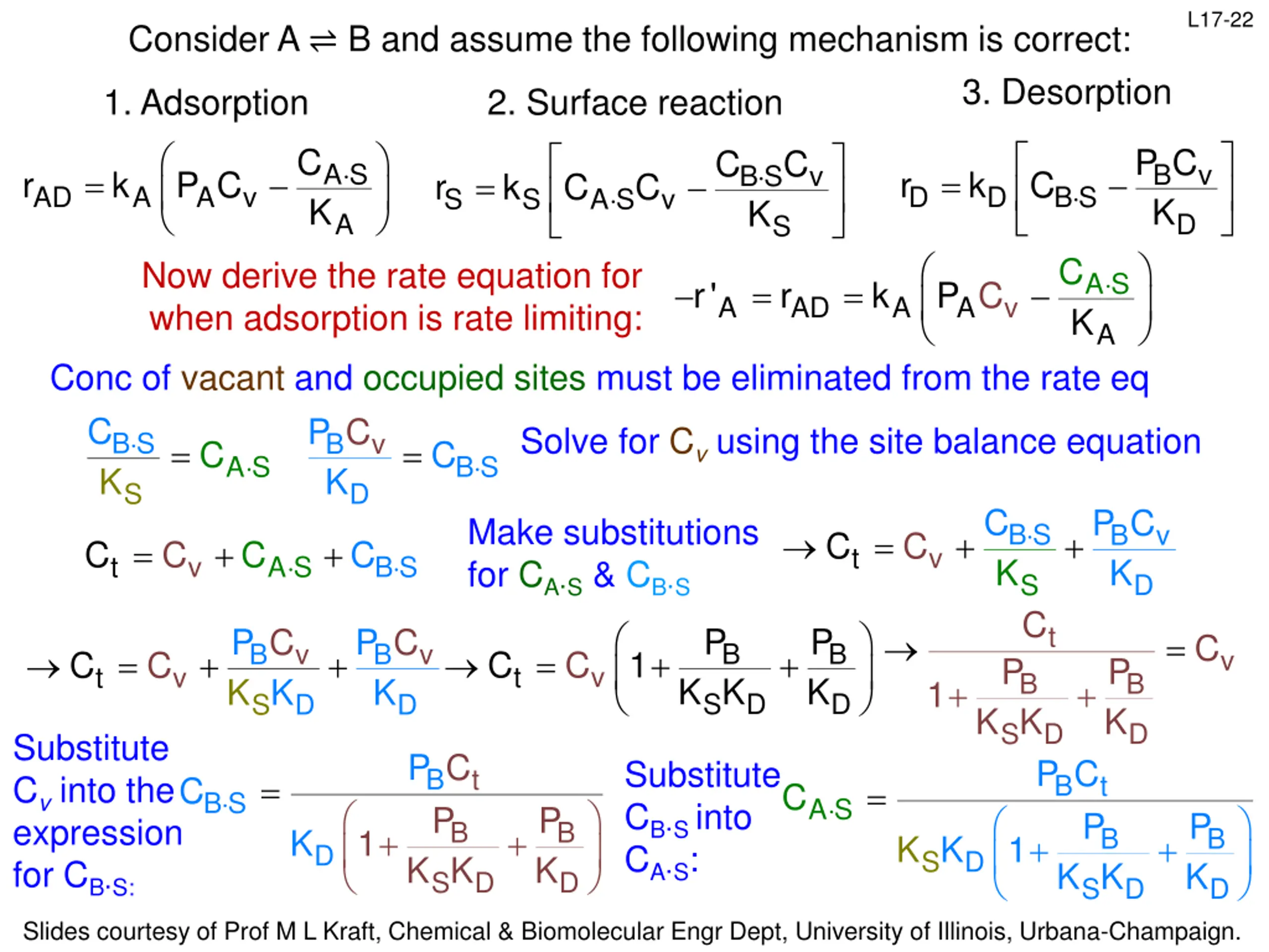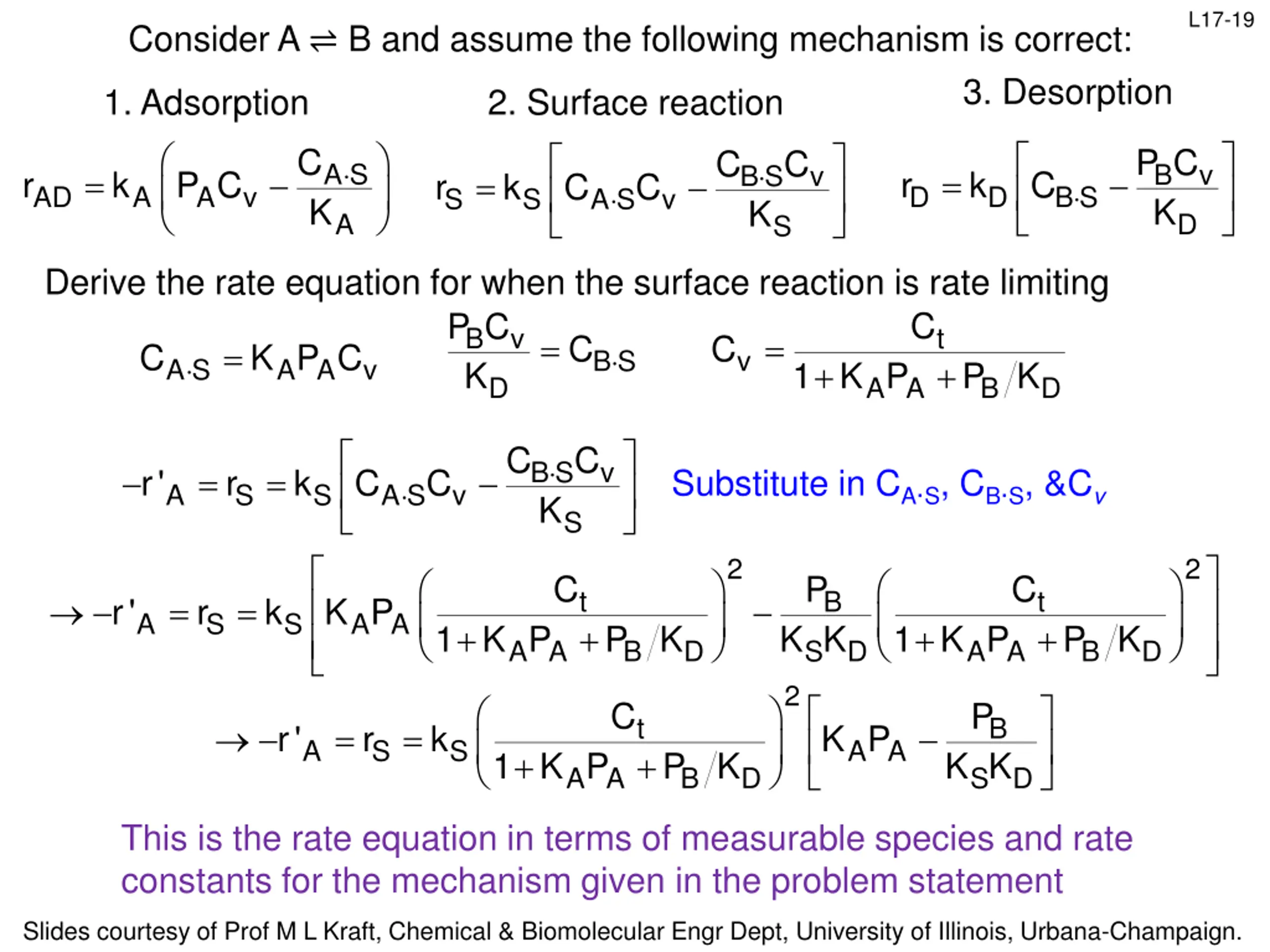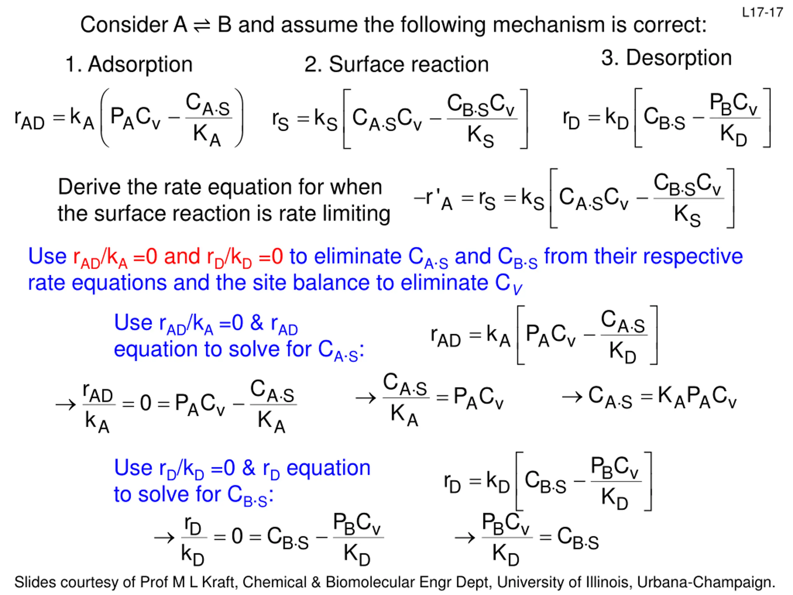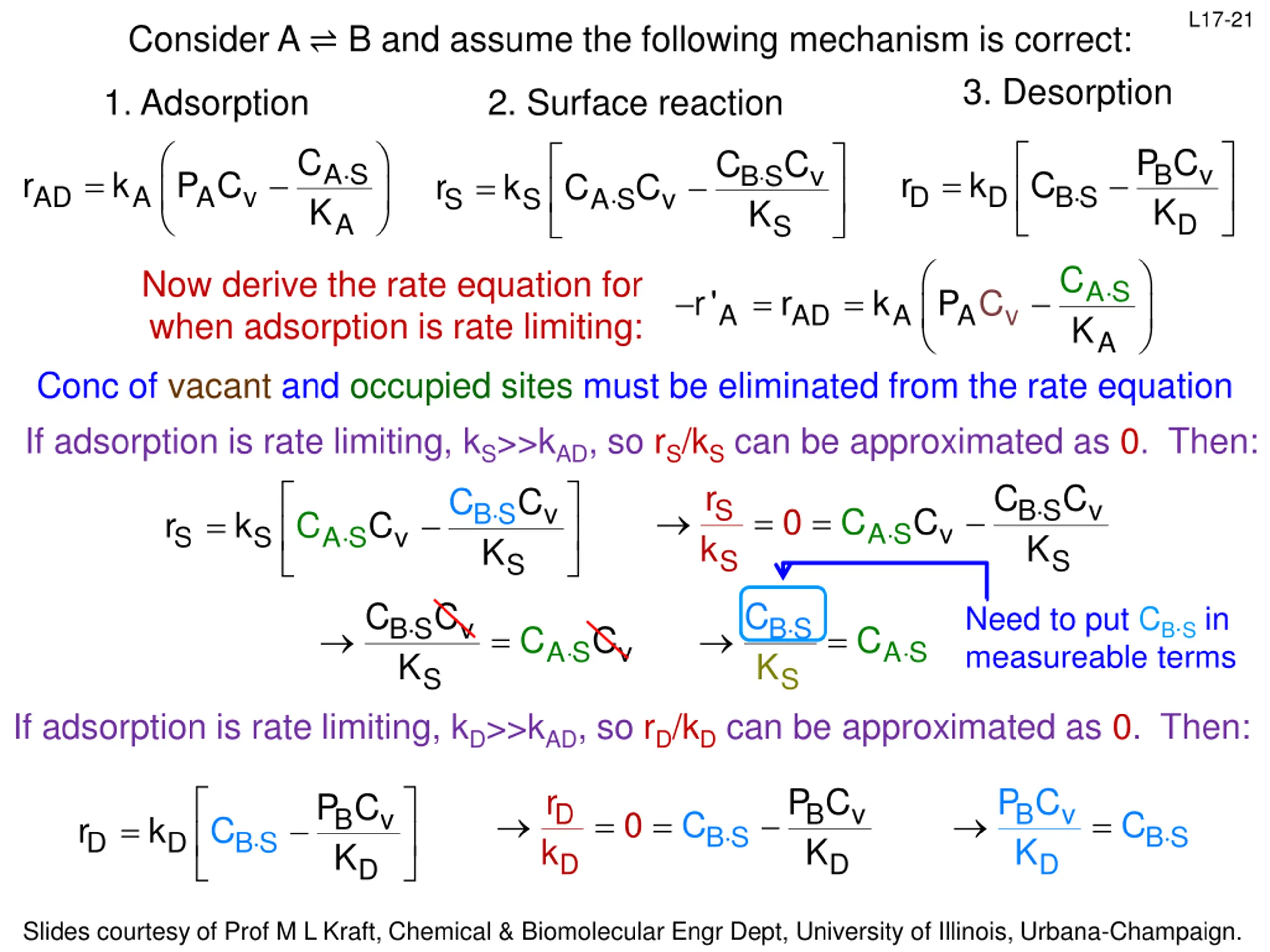 L17-21 Consider A B and assume the following mechanism is correct: 3. Desorption 1. Adsorption 2. Surface reaction = C P C C C A S K B K v B S K v = = AD r k P C D r k C S r k C C B S A A v D A S S v A D S C Now derive the rate equation for when adsorption is rate limiting: Conc of vacant and occupied sites must be eliminated from the rate equation If adsorption is rate limiting, kS>>kAD, so rS/kS can be approximated as 0. Then: = S K A S = = r' AD r k P C A A A v K A S r k C C C C B K S v B S v = = 0 C C S r k C C A S v S A S v S S C C C Need to put CB S in measureable terms B S K v B S K = = C C C A S v A S S S If adsorption is rate limiting, kD>>kAD, so rD/kD can be approximated as 0. Then: D r k P C P C P C B K v B K v = = = B K v 0 C C = D r k C B S B S D B S D D D D Slides courtesy of Prof M L Kraft, Chemical & Biomolecular Engr Dept, University of Illinois, Urbana-Champaign.
