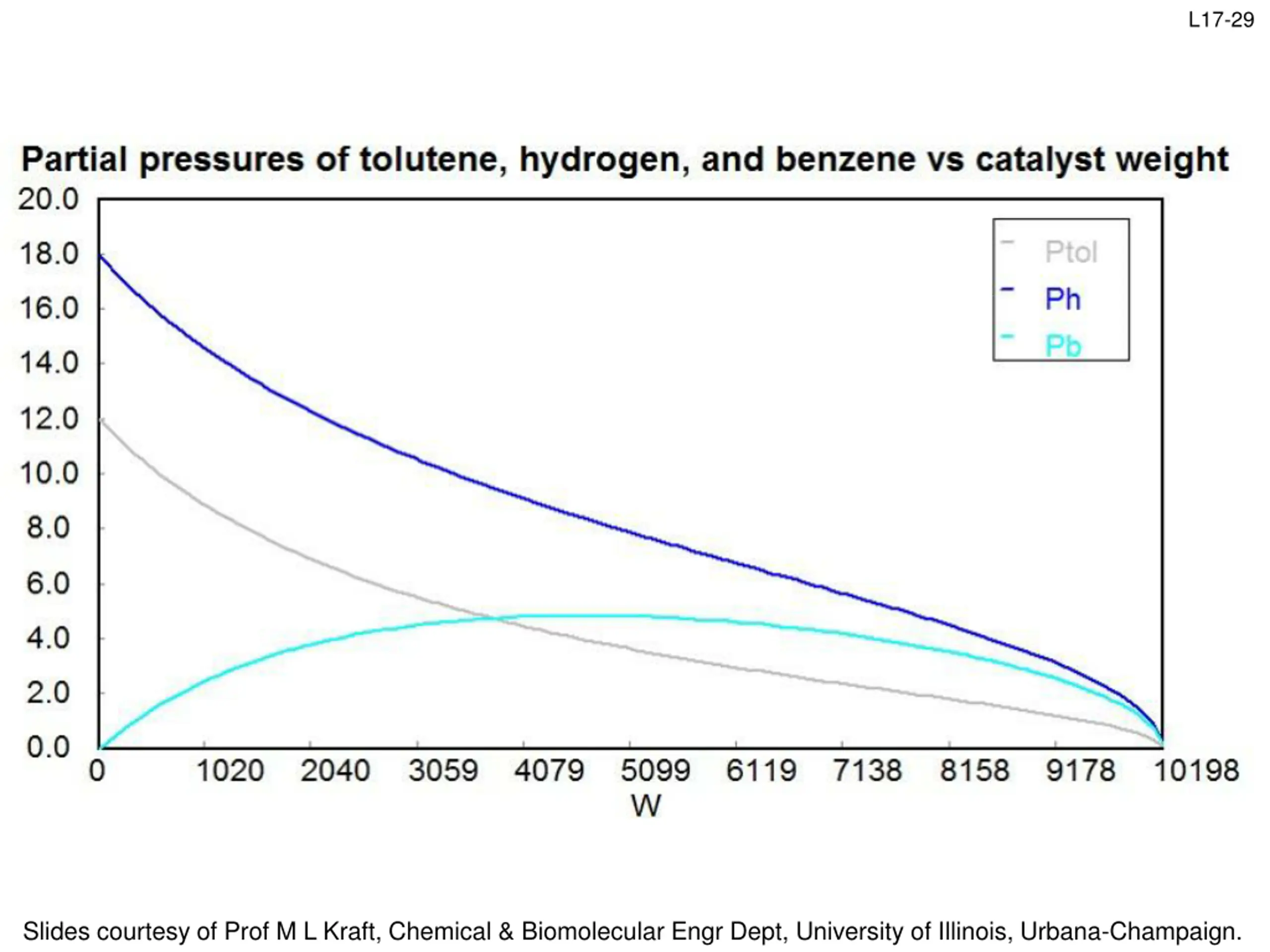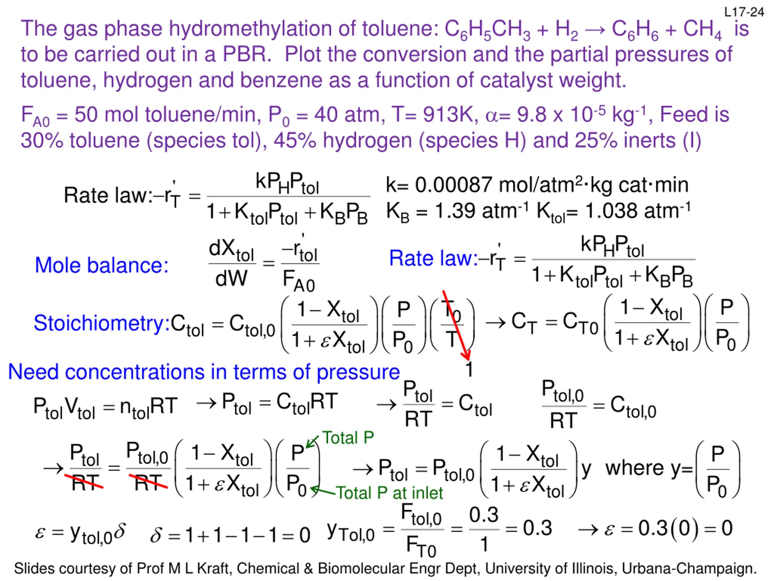 L17-24 The gas phase hydromethylation of toluene: C6H5CH3 + H2 C6H6 + CH4 is to be carried out in a PBR. Plot the conversion and the partial pressures of toluene, hydrogen and benzene as a function of catalyst weight. FA0 = 50 mol toluene/min, P0 = 40 atm, T= 913K, = 9.8 x 10-5 kg-1, Feed is 30% toluene (species tol), 45% hydrogen (species H) and 25% inerts (I) kP P k= 0.00087 mol/atm2 kg cat min KB = 1.39 atm-1 Ktol= 1.038 atm-1 ' H tol = r Rate law: T 1 K P + + ' tol r F 1 X 1 + B B K P tol tol kP P dX dW ' H tol = r tol Rate law: = Mole balance: T 1 K P + + + B B K P tol tol A0 1 X 1 P P T T P P 1 C tol tol 0 = C C = C C Stoichiometry: T T0 tol tol,0 X X tol 0 tol 0 Need concentrations in terms of pressure P V n RT = tol,0 P RT P RT tol = P C RT = = C tol tol tol tol,0 tol tol tol Total P tol,0 P RT P RT 1 X 1 + P P 1 X 1 + 0.3 1 P P tol tol X tol = = P tol,0 P y where y= tol X tol 0 tol 0 Total P at inlet tol,0 F F ( ) = = = = = y 0.3 0.3 0 0 = y 1 1 1 1 = + = 0 Tol,0 tol,0 T0 Slides courtesy of Prof M L Kraft, Chemical & Biomolecular Engr Dept, University of Illinois, Urbana-Champaign.
