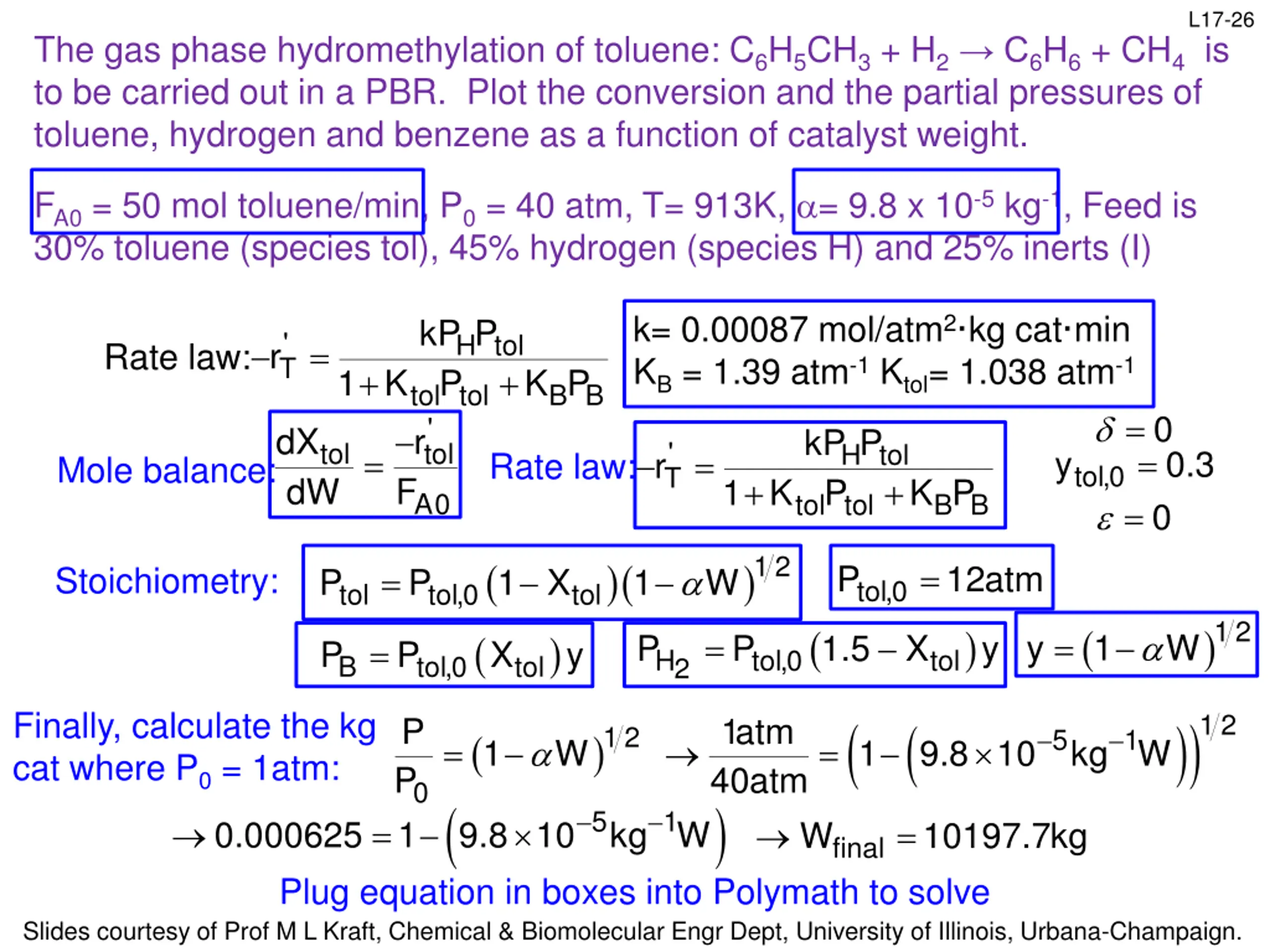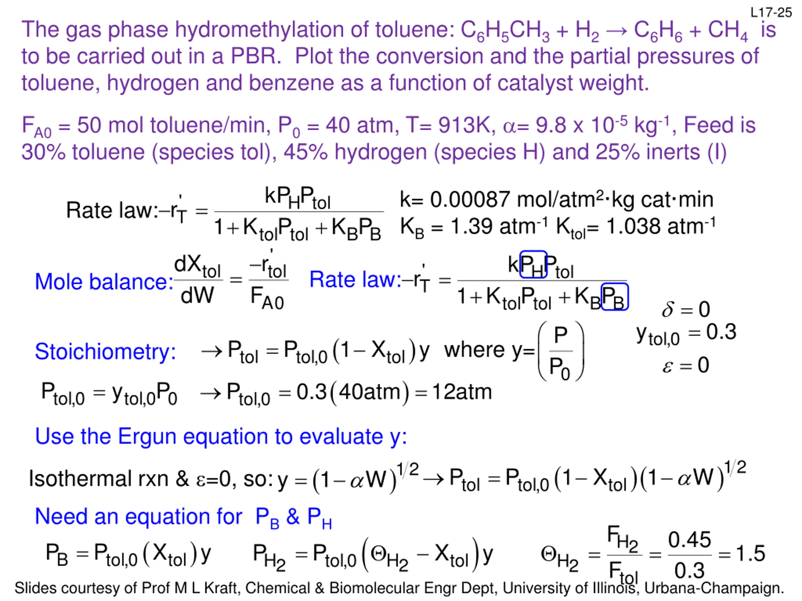 L17-25 The gas phase hydromethylation of toluene: C6H5CH3 + H2 C6H6 + CH4 is to be carried out in a PBR. Plot the conversion and the partial pressures of toluene, hydrogen and benzene as a function of catalyst weight. FA0 = 50 mol toluene/min, P0 = 40 atm, T= 913K, = 9.8 x 10-5 kg-1, Feed is 30% toluene (species tol), 45% hydrogen (species H) and 25% inerts (I) kP P k= 0.00087 mol/atm2 kg cat min KB = 1.39 atm-1 Ktol= 1.038 atm-1 kP P r 1 K P + + ) 0.3 40atm 12atm = ' H tol = r Rate law: T 1 K P + = + B B K P tol tol ' tol r F dX dW ' tol H tol = Rate law: Mole balance: T B B K P A0 tol tol = tol,0 = 0 = y 0.3 0 P P ( ( ) = 1 X P tol,0 P = y where y= Stoichiometry: tol tol 0 = tol,0 P y P tol,0 P tol,0 0 Use the Ergun equation to evaluate y: )1 2 ( )( )1 2 ( = 1 X Isothermal rxn & =0, so: P tol,0 P 1 W = y 1 W tol tol Need an equation for PB & PH ( B tol,0 tol P P X = F ( ) 0.45 0.3 H2 F ) = = = = y P tol,0 P X y 1.5 H H tol H2 2 2 tol Slides courtesy of Prof M L Kraft, Chemical & Biomolecular Engr Dept, University of Illinois, Urbana-Champaign.