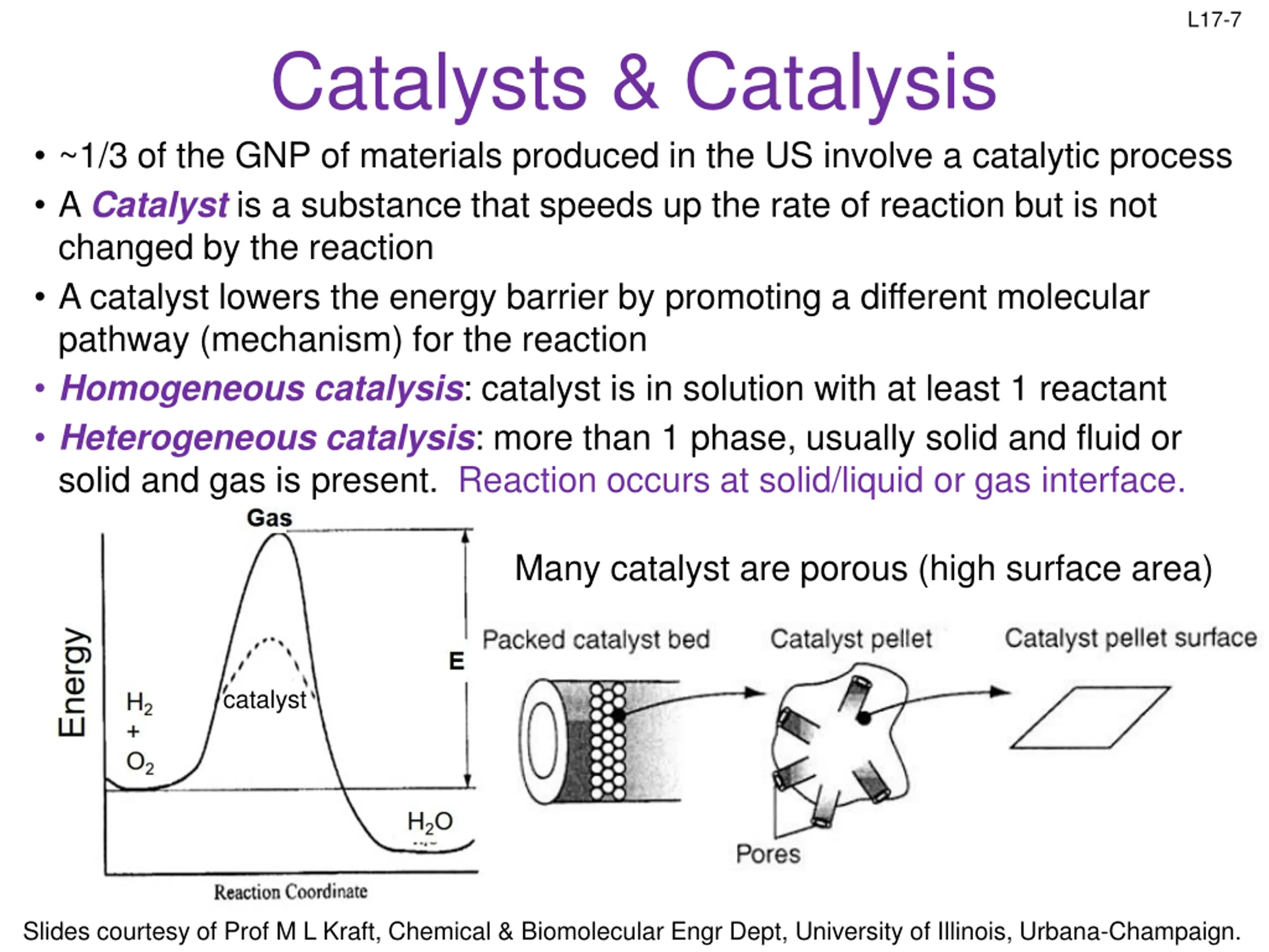 L17-7 Catalysts & Catalysis ~1/3 of the GNP of materials produced in the US involve a catalytic process A Catalyst is a substance that speeds up the rate of reaction but is not changed by the reaction A catalyst lowers the energy barrier by promoting a different molecular pathway (mechanism) for the reaction Homogeneous catalysis: catalyst is in solution with at least 1 reactant Heterogeneous catalysis: more than 1 phase, usually solid and fluid or solid and gas is present. Reaction occurs at solid/liquid or gas interface. Many catalyst are porous (high surface area) catalyst Slides courtesy of Prof M L Kraft, Chemical & Biomolecular Engr Dept, University of Illinois, Urbana-Champaign.
