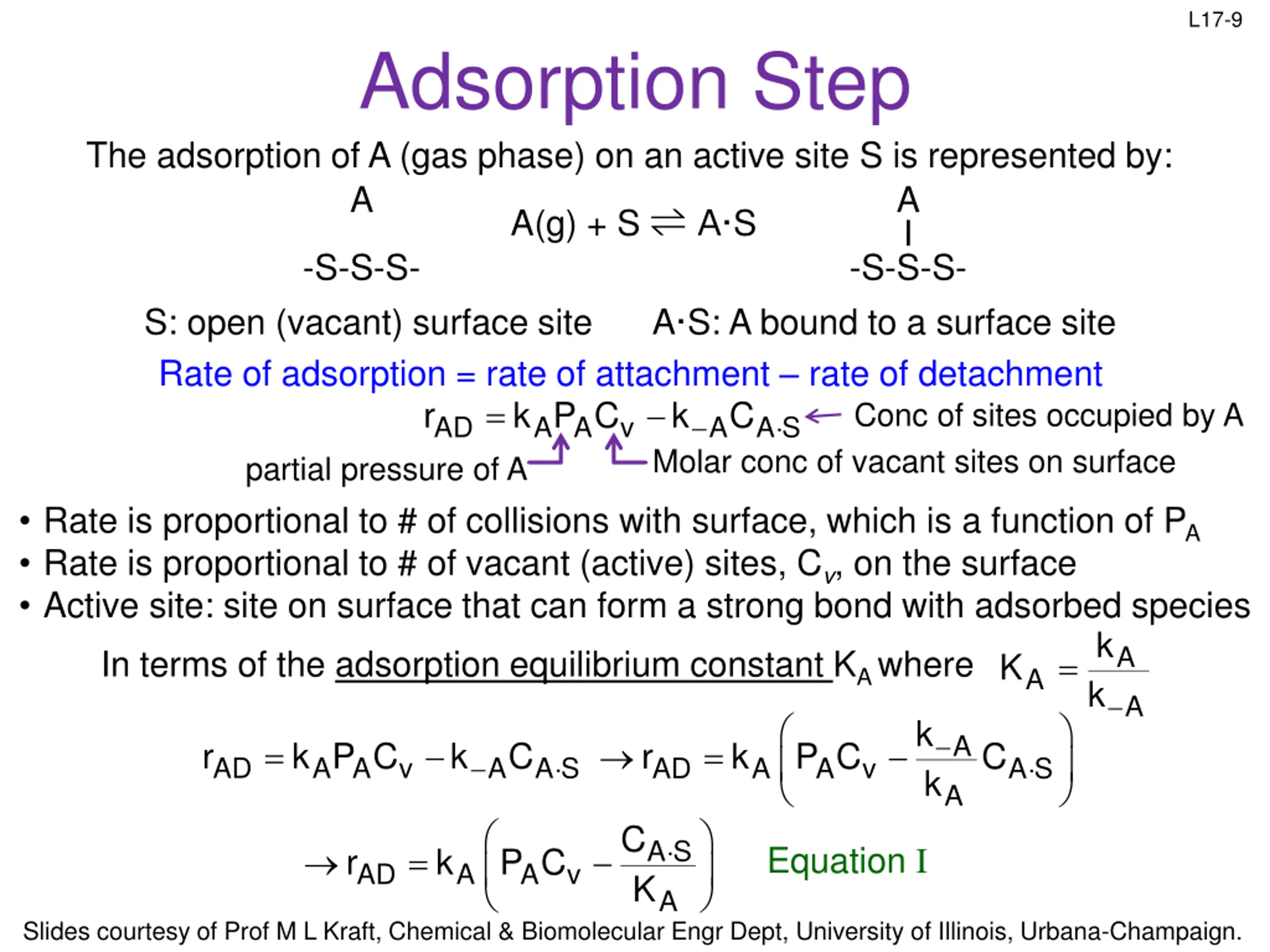 L17-9 Adsorption Step The adsorption of A (gas phase) on an active site S is represented by: A A I A(g) + S A S -S-S-S- -S-S-S- S: open (vacant) surface site Rate of adsorption = rate of attachment rate of detachment r k P C = partial pressure of A Rate is proportional to # of collisions with surface, which is a function of PA Rate is proportional to # of vacant (active) sites, Cv, on the surface Active site: site on surface that can form a strong bond with adsorbed species A S: A bound to a surface site Molar conc of vacant sites on surface k C Conc of sites occupied by A A S AD A A v A k k A In terms of the adsorption equilibrium constant KA where = K A A k k A = = AD r A A k P C k C AD r k P C C A S A S v A A A v A C A S K = Equation I AD r k P C A A v A Slides courtesy of Prof M L Kraft, Chemical & Biomolecular Engr Dept, University of Illinois, Urbana-Champaign.