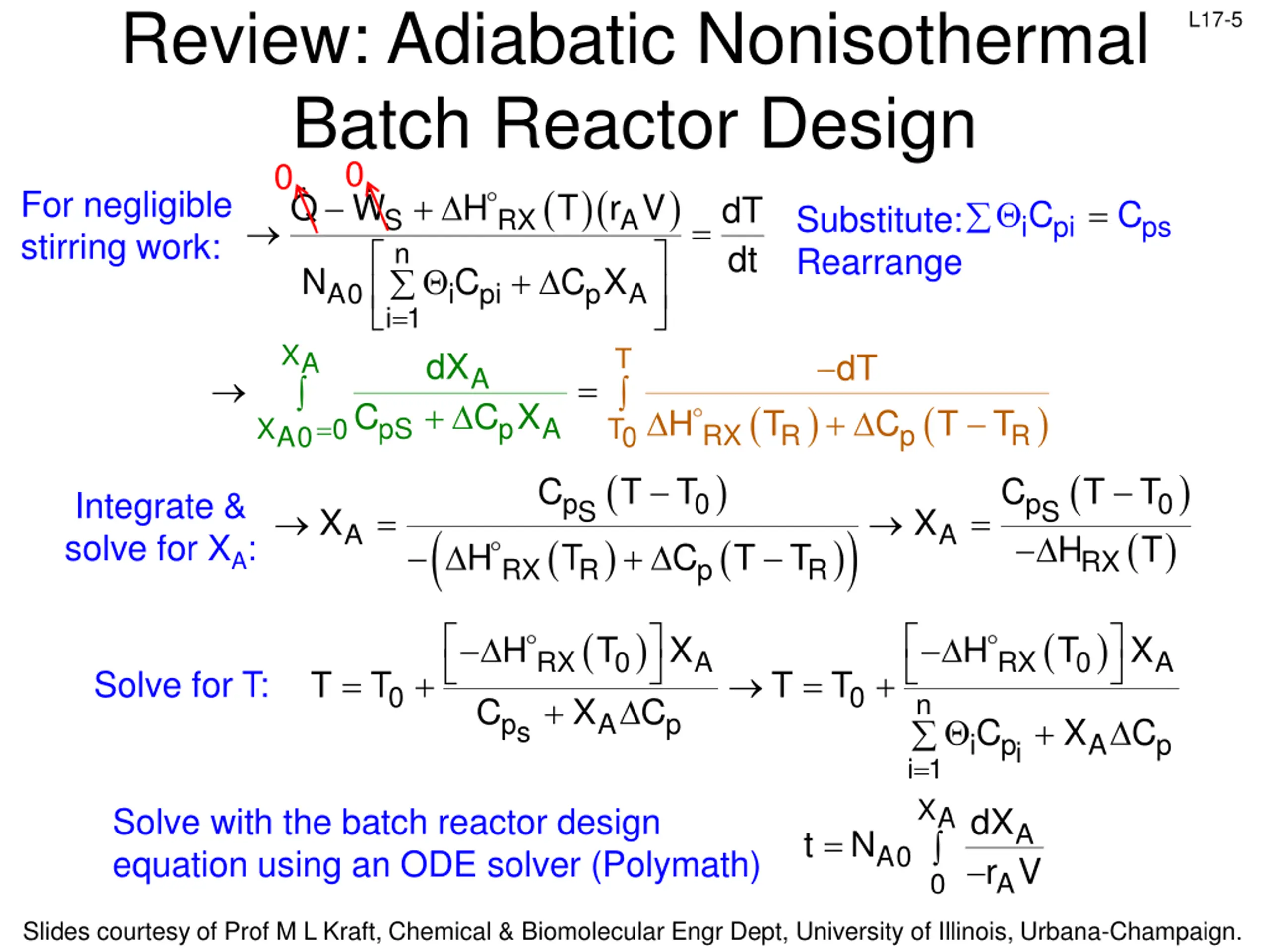 Review: Nonisothermal Batch Reactor Design ( S i0 pi i0 i 1 n i pi i 1 = + 1 i Put the energy balance in terms of conversion: L17-4 n ) ( )( T r V ) + 0 Q W F C T T H RX A dT dt = = NC ( )( T ) Q W H r V S RX A No flow, so: n N C i p i = N N ( ) i0 = + = i & C = N N X where C i A0 i i A i p i P A 0 ( )( T r V ) + Q W H dT d S RX A = n t + N C C X A0 i p i p A = i 1 Solve with the batch reactor design equation using an ODE solver (Polymath): dX dt A = N r V A0 A Slides courtesy of Prof M L Kraft, Chemical & Biomolecular Engr Dept, University of Illinois, Urbana-Champaign.