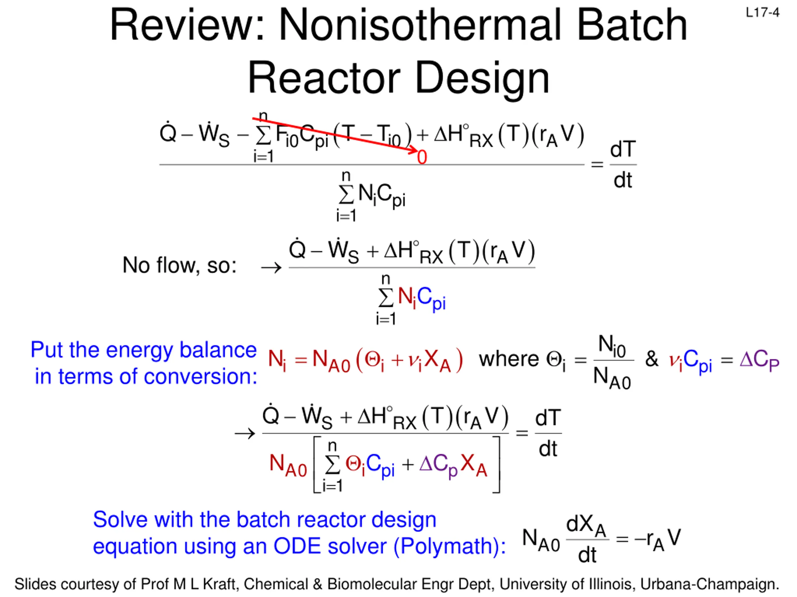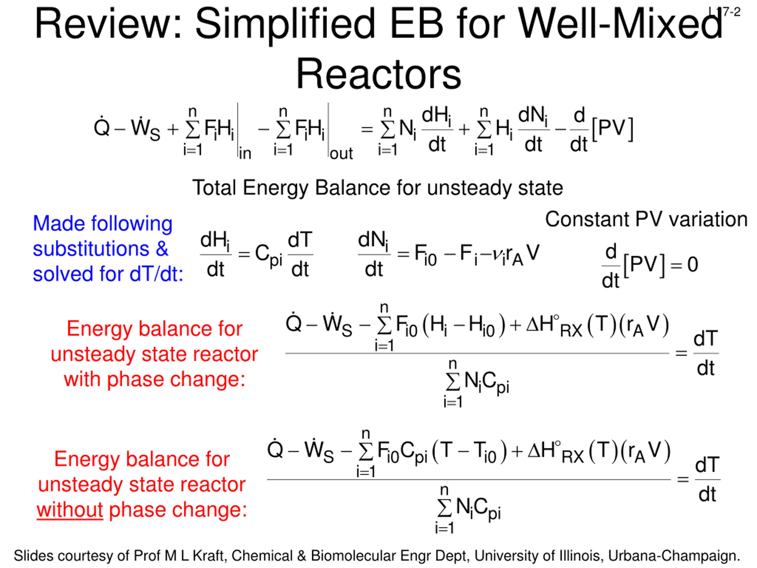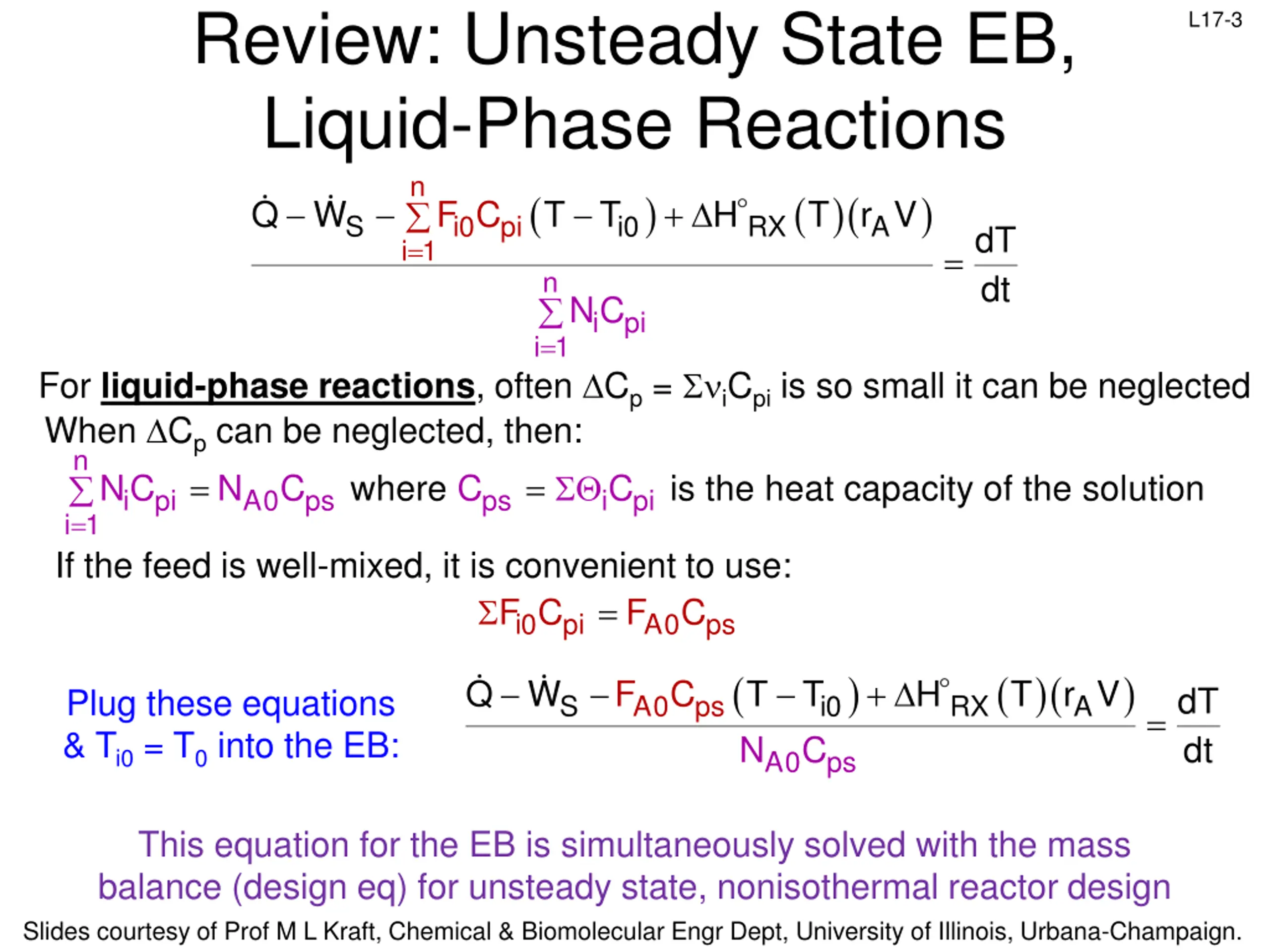 Review: Simplified EB for Well-Mixed Reactors n n n S i i i i i 1 i 1 i 1 in out = = = L17-2 n dH dt dN dt d dt i i + = + Q W FH FH N H PV i i i 1 = Total Energy Balance for unsteady state Constant PV variation Made following substitutions & solved for dT/dt: dH dt dN dt dT dt i i dPV dt = i A r V = F F C i0 i pi = 0 n ( ) ( )( T r V ) + Q W F H H H Energy balance for unsteady state reactor with phase change: S i0 i i0 RX A dT dt i 1 = = n i pi NC i 1 = n ( ) ( )( T r V ) + Q W i0 pi F C T T H Energy balance for unsteady state reactor without phase change: S i0 RX A dT dt i 1 = = n i pi NC i 1 = Slides courtesy of Prof M L Kraft, Chemical & Biomolecular Engr Dept, University of Illinois, Urbana-Champaign.