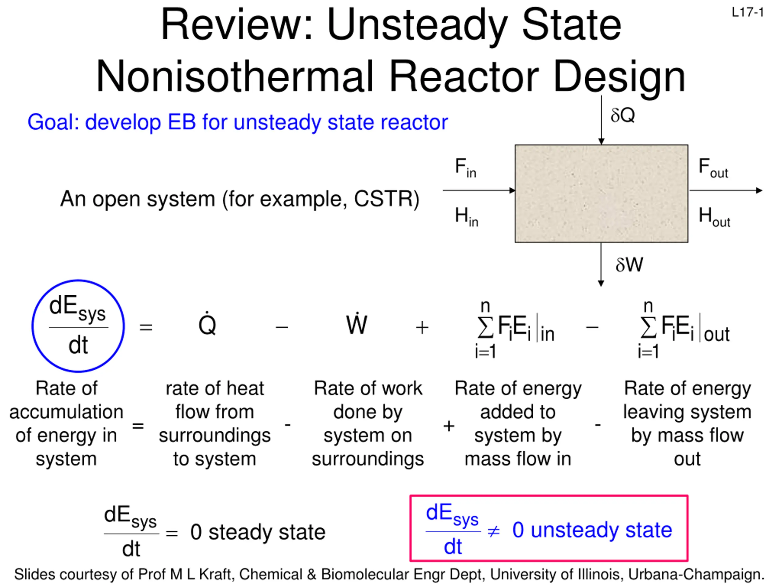 Review: Unsteady State Nonisothermal Reactor Design Goal: develop EB for unsteady state reactor L17-1 Q Fin Fout An open system (for example, CSTR) Hin Hout W dE n n sys dt = + Q W i i in FE i i out FE i 1 = i 1 = Rate of accumulation of energy in system rate of heat flow from surroundings to system Rate of work done by system on surroundings Rate of energy added to system by mass flow in Rate of energy leaving system by mass flow out = - + - dE dE sys dt sys dt 0 unsteady state = 0 steady state Slides courtesy of Prof M L Kraft, Chemical & Biomolecular Engr Dept, University of Illinois, Urbana-Champaign.
