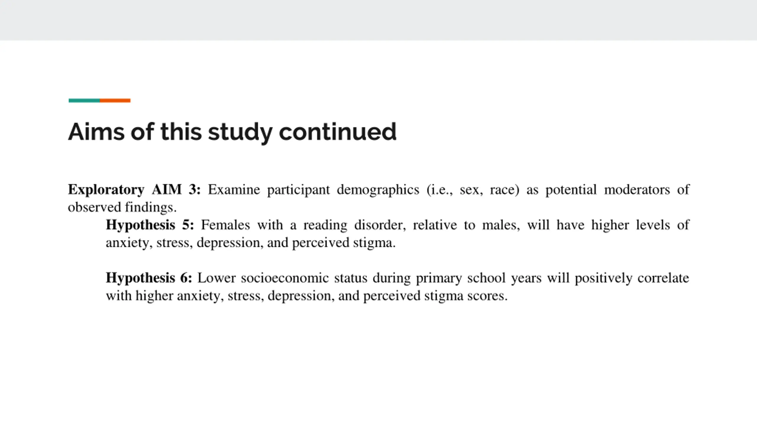 Aims of this study continued Exploratory AIM 3: Examine participant demographics (i.e., sex, race) as potential moderators of observed findings. Hypothesis 5: Females with a reading disorder, relative to males, will have higher levels of anxiety, stress, depression, and perceived stigma. Hypothesis 6: Lower socioeconomic status during primary school years will positively correlate with higher anxiety, stress, depression, and perceived stigma scores.