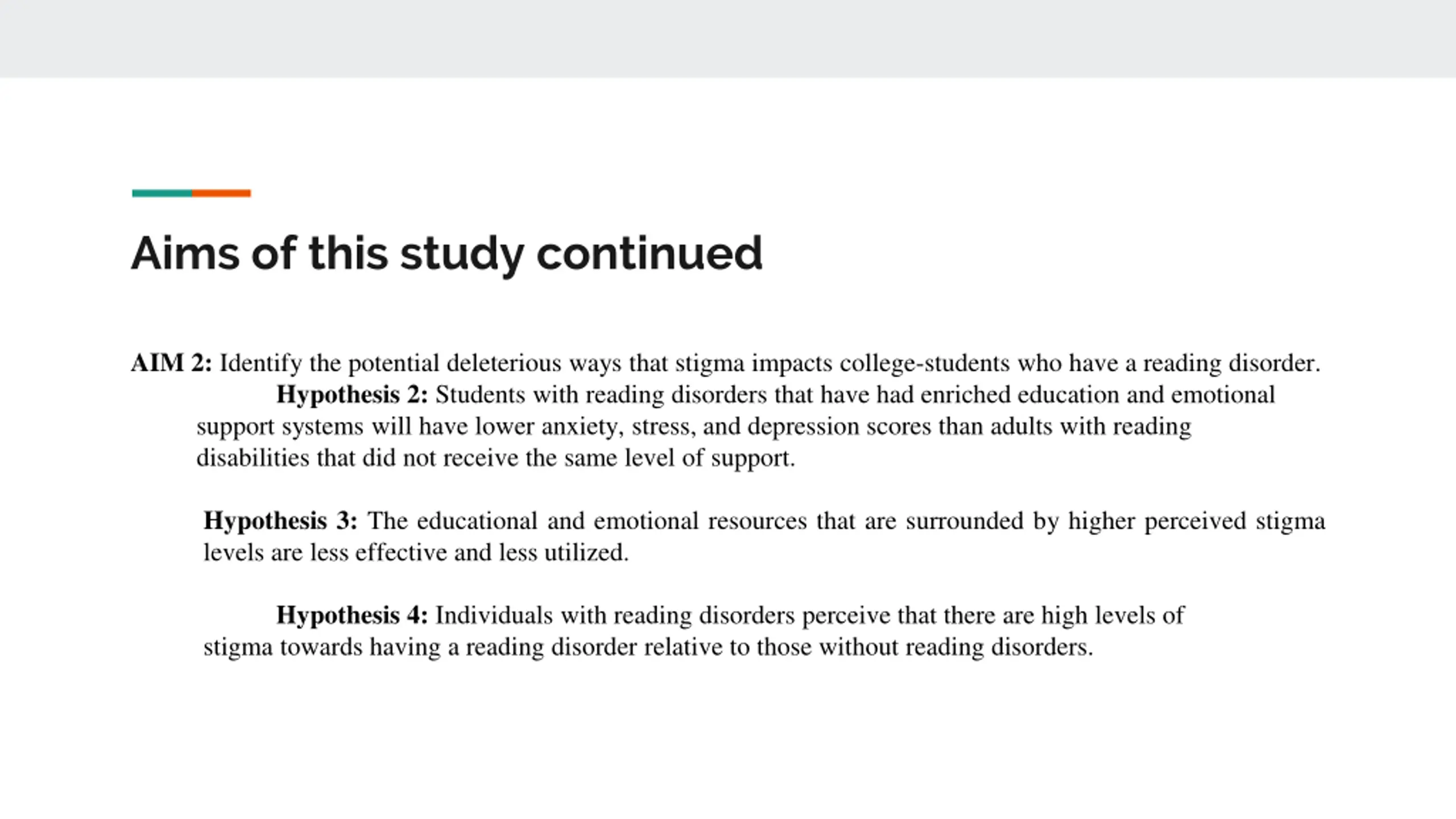 Aims of this study continued AIM 2: Identify the potential deleterious ways that stigma impacts college-students who have a reading disorder. Hypothesis 2: Students with reading disorders that have had enriched education and emotional support systems will have lower anxiety, stress, and depression scores than adults with reading disabilities that did not receive the same level of support. Hypothesis 3: The educational and emotional resources that are surrounded by higher perceived stigma levels are less effective and less utilized. Hypothesis 4: Individuals with reading disorders perceive that there are high levels of stigma towards having a reading disorder relative to those without reading disorders.