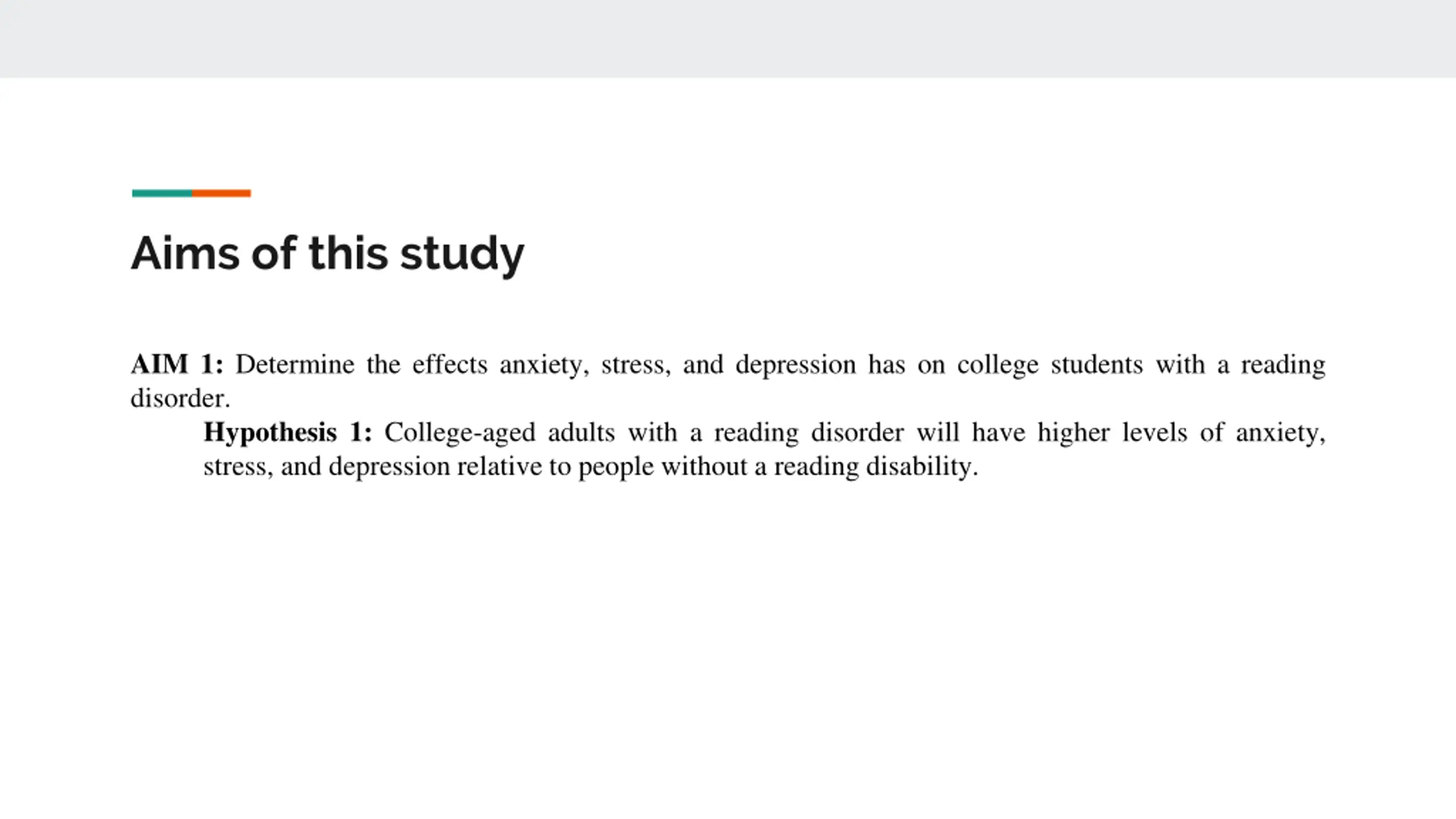 Aims of this study AIM 1: Determine the effects anxiety, stress, and depression has on college students with a reading disorder. Hypothesis 1: College-aged adults with a reading disorder will have higher levels of anxiety, stress, and depression relative to people without a reading disability.
