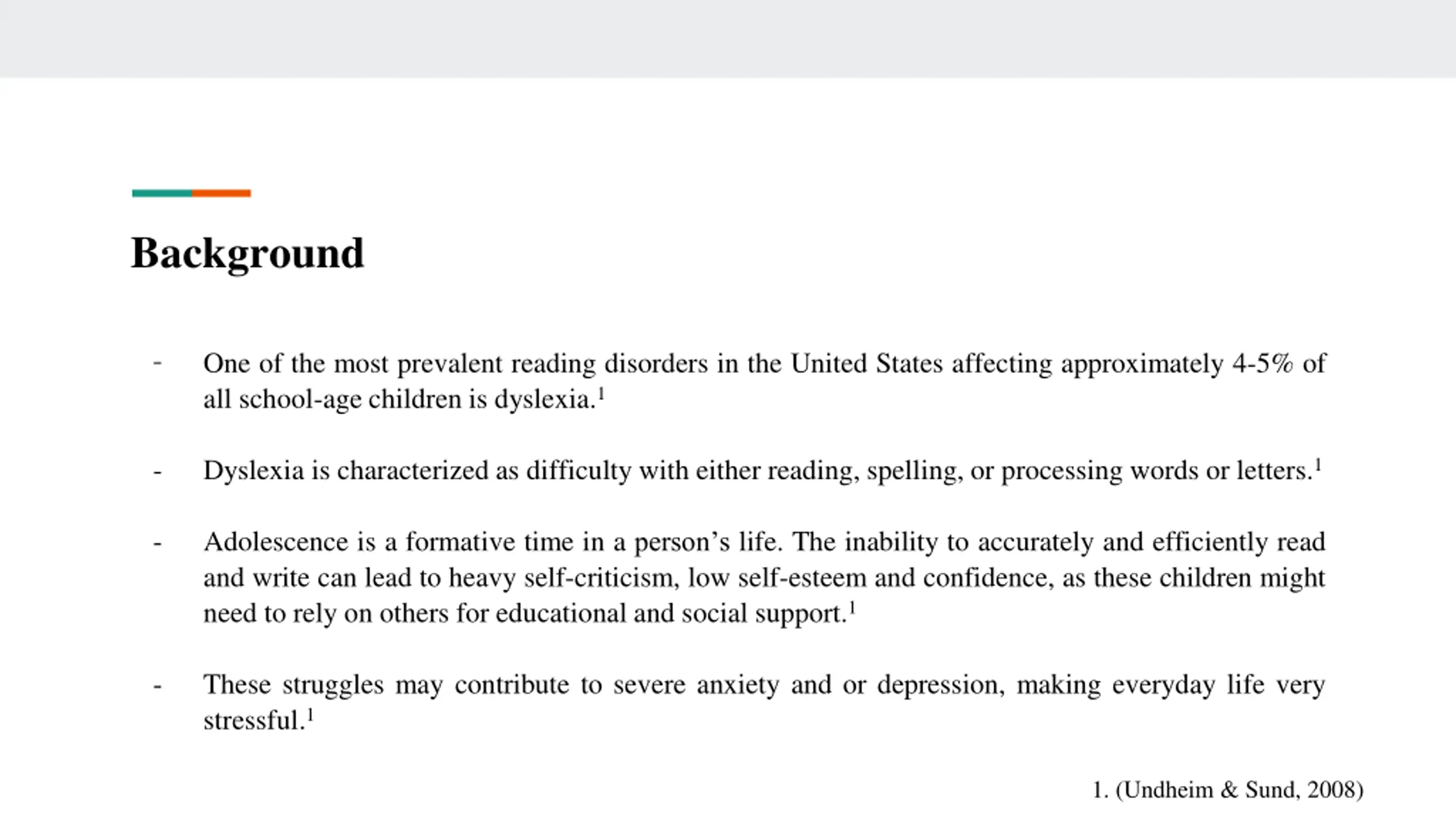 Background - One of the most prevalent reading disorders in the United States affecting approximately 4-5% of all school-age children is dyslexia.1 - Dyslexia is characterized as difficulty with either reading, spelling, or processing words or letters.1 - Adolescence is a formative time in a person s life. The inability to accurately and efficiently read and write can lead to heavy self-criticism, low self-esteem and confidence, as these children might need to rely on others for educational and social support.1 - These struggles may contribute to severe anxiety and or depression, making everyday life very stressful.1 1. (Undheim & Sund, 2008)