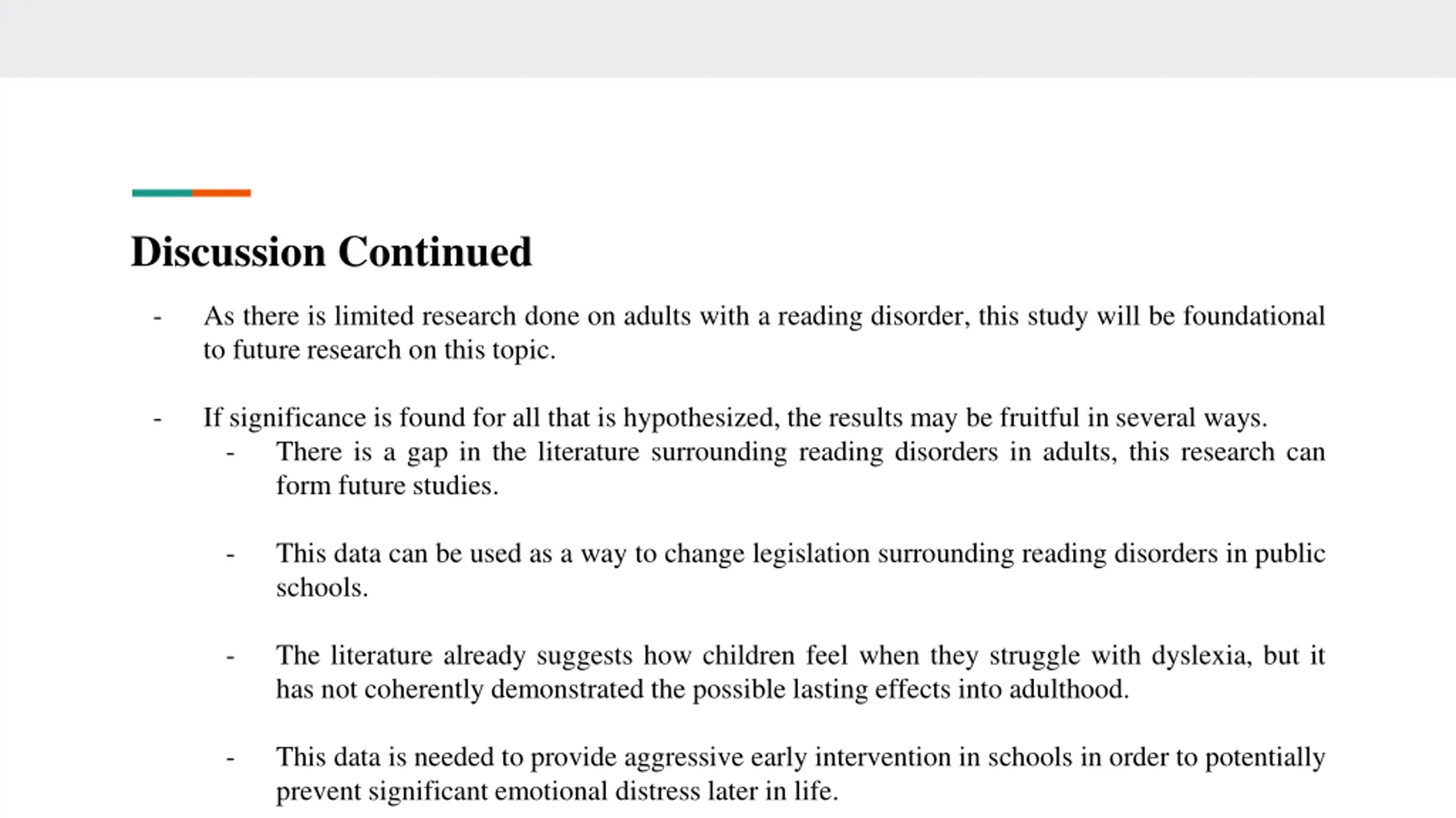 Discussion Continued - As there is limited research done on adults with a reading disorder, this study will be foundational to future research on this topic. - If significance is found for all that is hypothesized, the results may be fruitful in several ways. - There is a gap in the literature surrounding reading disorders in adults, this research can form future studies. - This data can be used as a way to change legislation surrounding reading disorders in public schools. - The literature already suggests how children feel when they struggle with dyslexia, but it has not coherently demonstrated the possible lasting effects into adulthood. - This data is needed to provide aggressive early intervention in schools in order to potentially prevent significant emotional distress later in life.