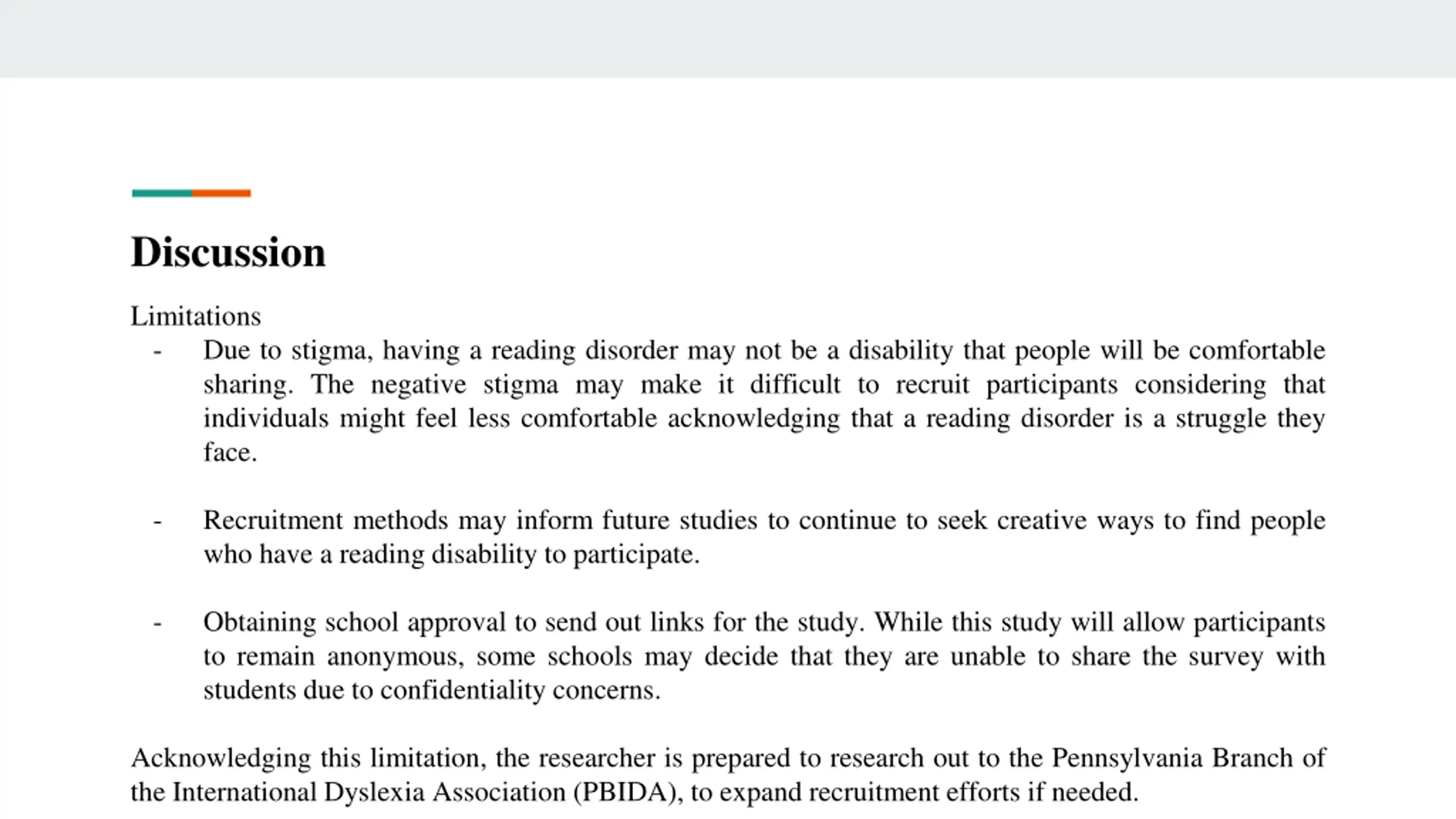 Discussion Limitations - Due to stigma, having a reading disorder may not be a disability that people will be comfortable sharing. The negative stigma may make it difficult to recruit participants considering that individuals might feel less comfortable acknowledging that a reading disorder is a struggle they face. - Recruitment methods may inform future studies to continue to seek creative ways to find people who have a reading disability to participate. - Obtaining school approval to send out links for the study. While this study will allow participants to remain anonymous, some schools may decide that they are unable to share the survey with students due to confidentiality concerns. Acknowledging this limitation, the researcher is prepared to research out to the Pennsylvania Branch of the International Dyslexia Association (PBIDA), to expand recruitment efforts if needed.