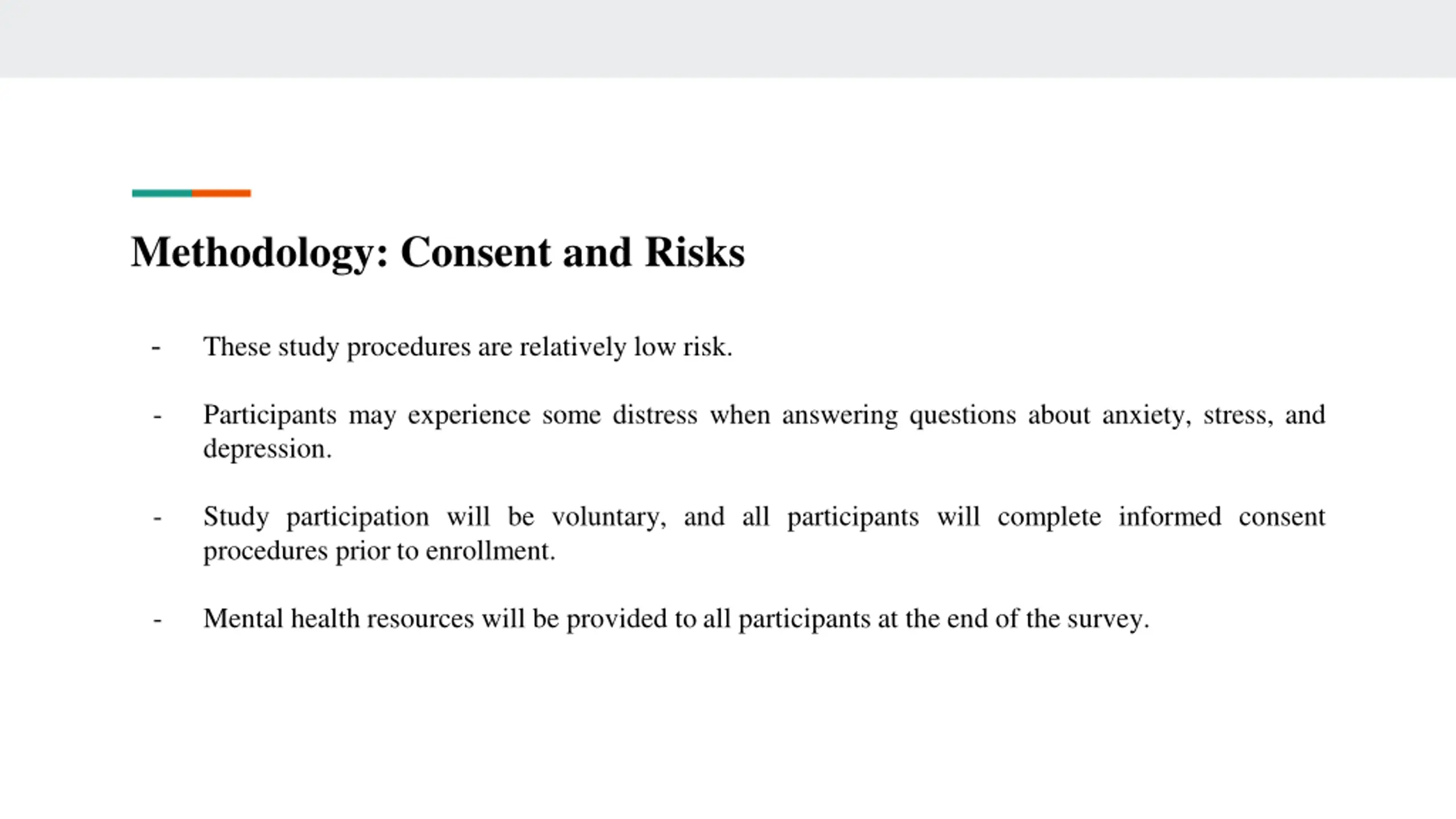 Methodology: Consent and Risks - These study procedures are relatively low risk. - Participants may experience some distress when answering questions about anxiety, stress, and depression. - Study participation will be voluntary, and all participants will complete informed consent procedures prior to enrollment. - Mental health resources will be provided to all participants at the end of the survey.