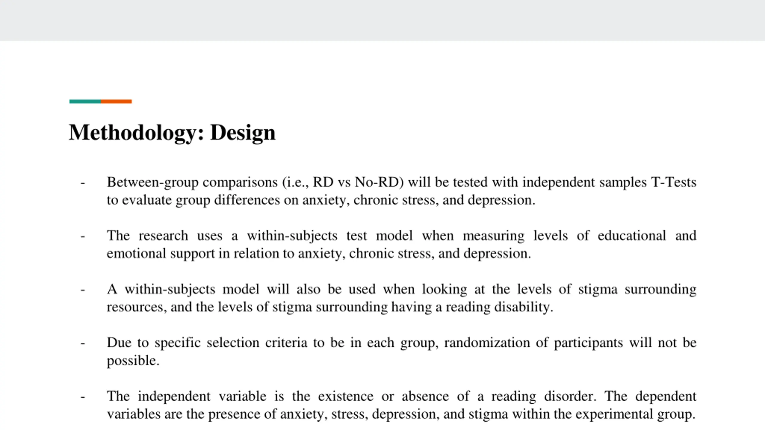 Methodology: Design - Between-group comparisons (i.e., RD vs No-RD) will be tested with independent samples T-Tests to evaluate group differences on anxiety, chronic stress, and depression. - The research uses a within-subjects test model when measuring levels of educational and emotional support in relation to anxiety, chronic stress, and depression. - A within-subjects model will also be used when looking at the levels of stigma surrounding resources, and the levels of stigma surrounding having a reading disability. - Due to specific selection criteria to be in each group, randomization of participants will not be possible. - The independent variable is the existence or absence of a reading disorder. The dependent variables are the presence of anxiety, stress, depression, and stigma within the experimental group.