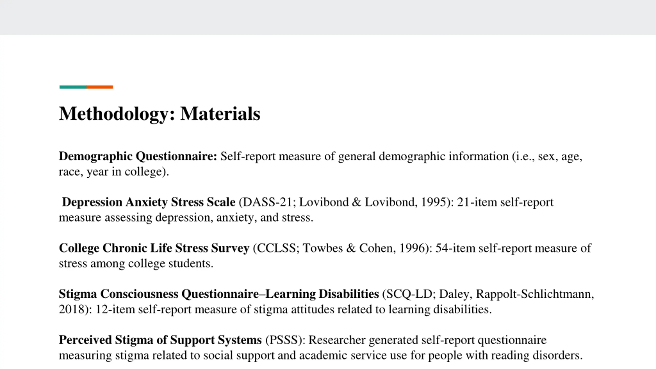 Methodology: Materials Demographic Questionnaire: Self-report measure of general demographic information (i.e., sex, age, race, year in college). Depression Anxiety Stress Scale (DASS-21; Lovibond & Lovibond, 1995): 21-item self-report measure assessing depression, anxiety, and stress. College Chronic Life Stress Survey (CCLSS; Towbes & Cohen, 1996): 54-item self-report measure of stress among college students. Stigma Consciousness Questionnaire Learning Disabilities (SCQ-LD; Daley, Rappolt-Schlichtmann, 2018): 12-item self-report measure of stigma attitudes related to learning disabilities. Perceived Stigma of Support Systems (PSSS): Researcher generated self-report questionnaire measuring stigma related to social support and academic service use for people with reading disorders.
