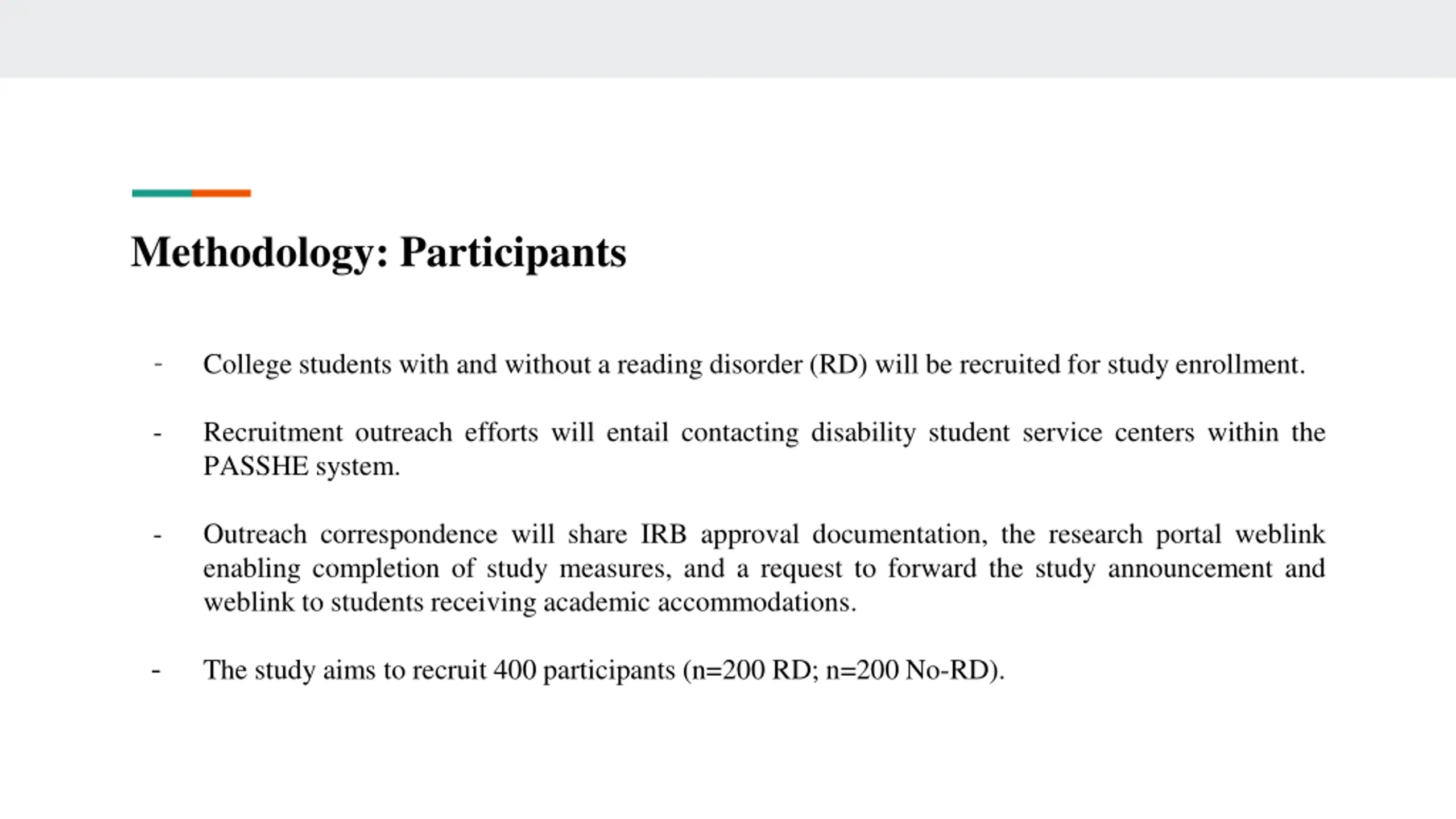 Methodology: Participants - College students with and without a reading disorder (RD) will be recruited for study enrollment. - Recruitment outreach efforts will entail contacting disability student service centers within the PASSHE system. - Outreach correspondence will share IRB approval documentation, the research portal weblink enabling completion of study measures, and a request to forward the study announcement and weblink to students receiving academic accommodations. - The study aims to recruit 400 participants (n=200 RD; n=200 No-RD).