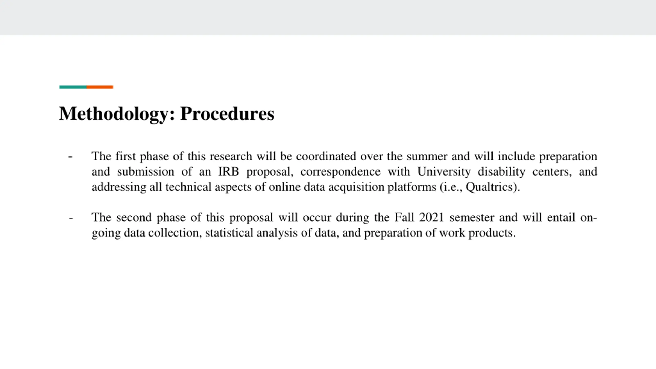 Methodology: Procedures - The first phase of this research will be coordinated over the summer and will include preparation and submission of an IRB proposal, correspondence with University disability centers, and addressing all technical aspects of online data acquisition platforms (i.e., Qualtrics). - The second phase of this proposal will occur during the Fall 2021 semester and will entail on- going data collection, statistical analysis of data, and preparation of work products.