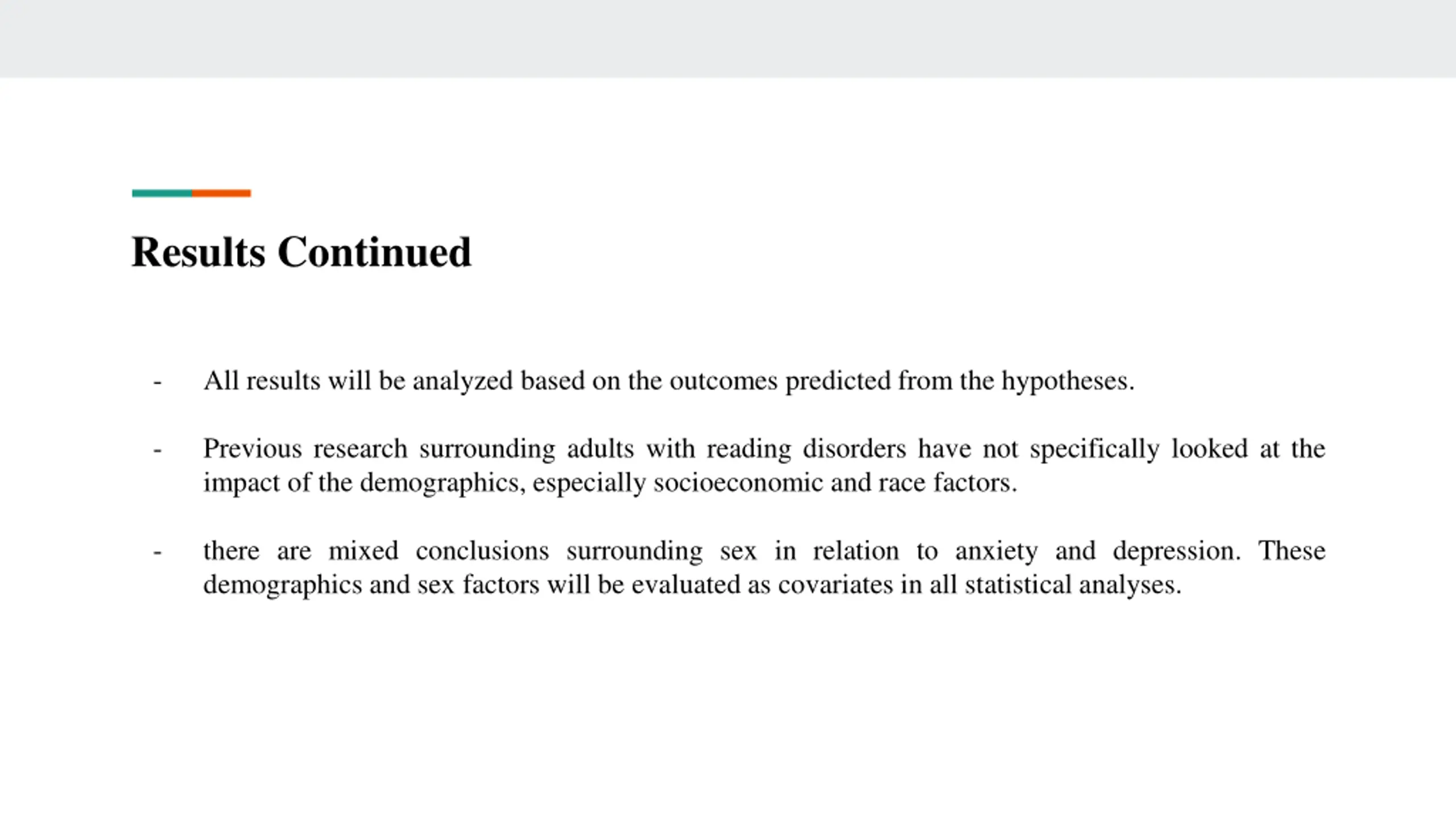 Results Continued - All results will be analyzed based on the outcomes predicted from the hypotheses. - Previous research surrounding adults with reading disorders have not specifically looked at the impact of the demographics, especially socioeconomic and race factors. - there are mixed conclusions surrounding sex in relation to anxiety and depression. These demographics and sex factors will be evaluated as covariates in all statistical analyses.