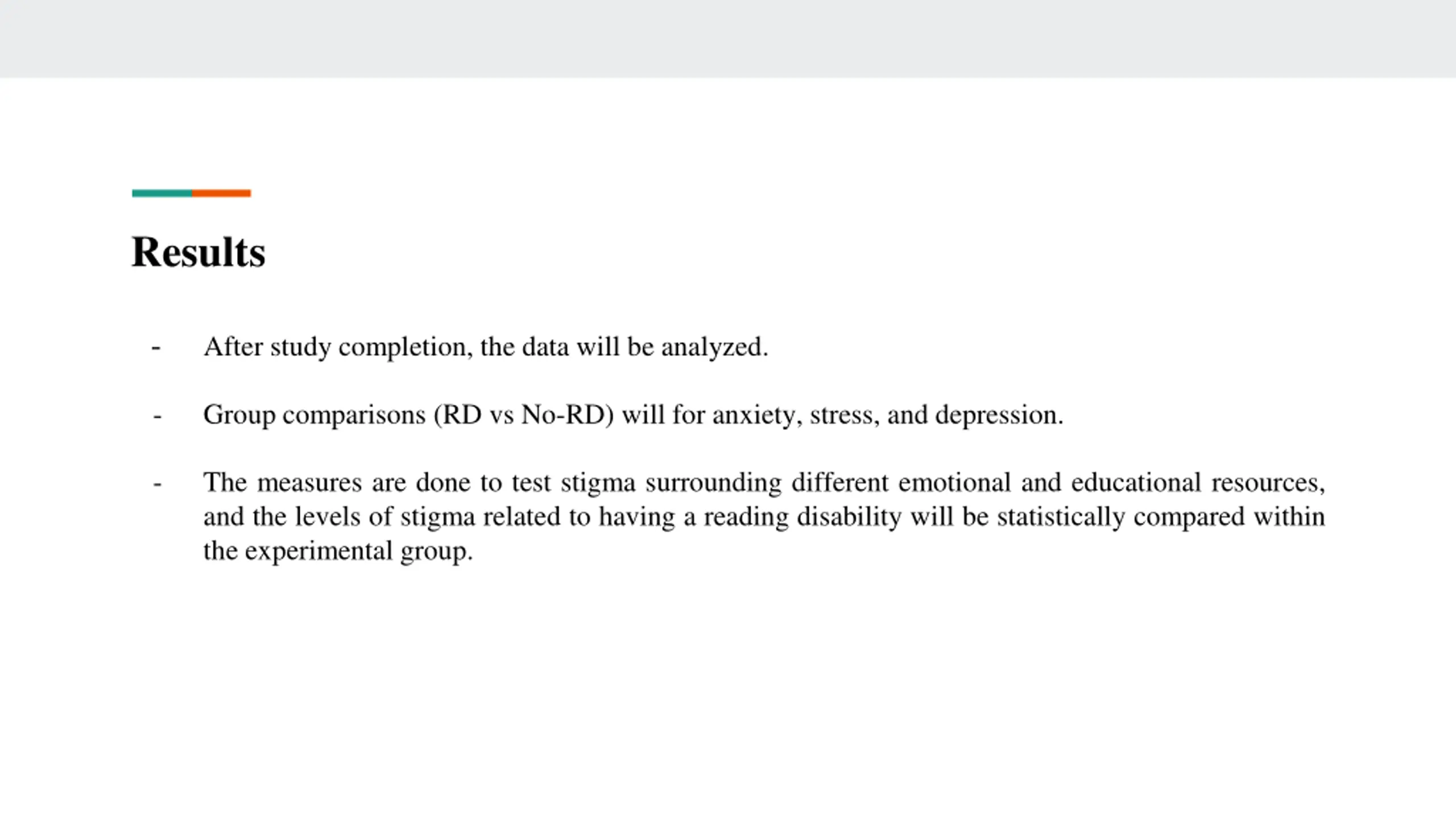 Results - After study completion, the data will be analyzed. - Group comparisons (RD vs No-RD) will for anxiety, stress, and depression. - The measures are done to test stigma surrounding different emotional and educational resources, and the levels of stigma related to having a reading disability will be statistically compared within the experimental group.