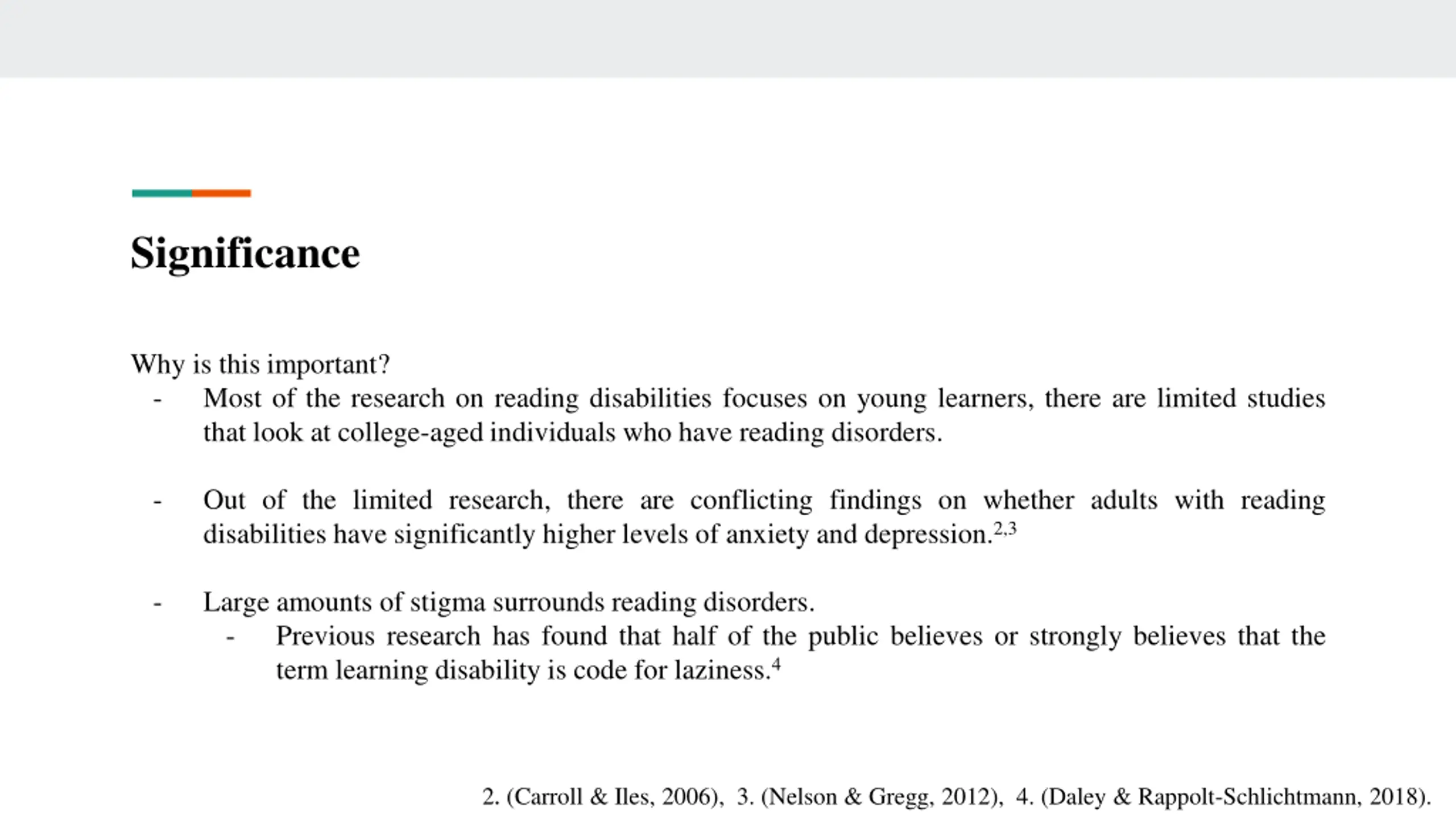 Significance Why is this important? - Most of the research on reading disabilities focuses on young learners, there are limited studies that look at college-aged individuals who have reading disorders. - Out of the limited research, there are conflicting findings on whether adults with reading disabilities have significantly higher levels of anxiety and depression.2,3 - Large amounts of stigma surrounds reading disorders. - Previous research has found that half of the public believes or strongly believes that the term learning disability is code for laziness.4 2. (Carroll & Iles, 2006), 3. (Nelson & Gregg, 2012), 4. (Daley & Rappolt-Schlichtmann, 2018).
