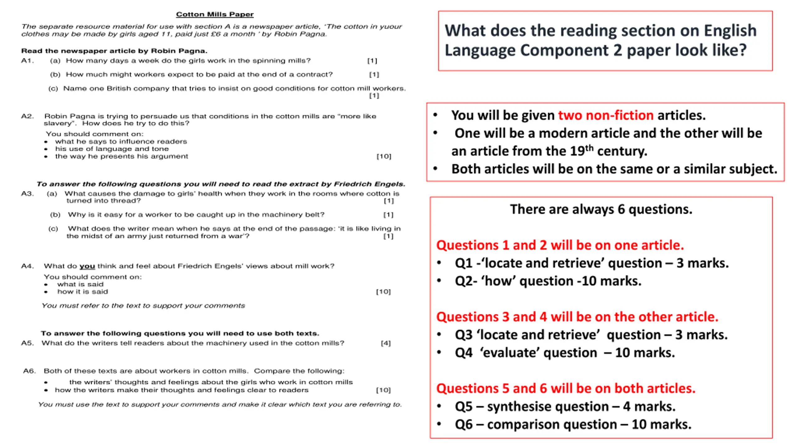 Cotton Mills Paper What does the reading section on English Language Component 2 paper look like? The separate resource material for use with section A is a newspaper article, The cotton in yuour clothes may be made by girls aged 11, paid just 6 a month by Robin Pagna. Read the newspaper article by Robin Pagna. A1. (a) How many days a week do the girls work in the spinning mills? [1] (b) How much might workers expect to be paid at the end of a contract? [1] (c) Name one British company that tries to insist on good conditions for cotton mill workers. A2. Robin Pagna is trying to persuade us that conditions in the cotton mills are more like slavery . How does he try to do this? You should comment on: what he says to influence readers his use of language and tone the way he presents his argument To answer the following questions you will need to read the extract by Friedrich Engels. A3. (a) What causes the damage to girls health when they work in the rooms where cotton is turned into thread? (b) Why is it easy for a worker to be caught up in the machinery belt? (c) What does the writer mean when he says at the end of the passage: it is like living in the midst of an army just returned from a war ? A4. What do you think and feel about Friedrich Engels views about mill work? You should comment on: what is said how it is said You must refer to the text to support your comments To answer the following questions you will need to use both texts. A5. What do the writers tell readers about the machinery used in the cotton mills? A6. Both of these texts are about workers in cotton mills. Compare the following: the writers thoughts and feelings about the girls who work in cotton mills how the writers make their thoughts and feelings clear to readers You must use the text to support your comments and make it clear which text you are referring to. [1] You will be given two non-fiction articles. One will be a modern article and the other will be an article from the 19th century. Both articles will be on the same or a similar subject. [10] [1] There are always 6 questions. [1] [1] Questions 1 and 2 will be on one article. Q1 - locate and retrieve question 3 marks. Q2- how question -10 marks. [10] Questions 3 and 4 will be on the other article. Q3 locate and retrieve question 3 marks. Q4 evaluate question 10 marks. [4] Questions 5 and 6 will be on both articles. Q5 synthesise question 4 marks. Q6 comparison question 10 marks. [10]