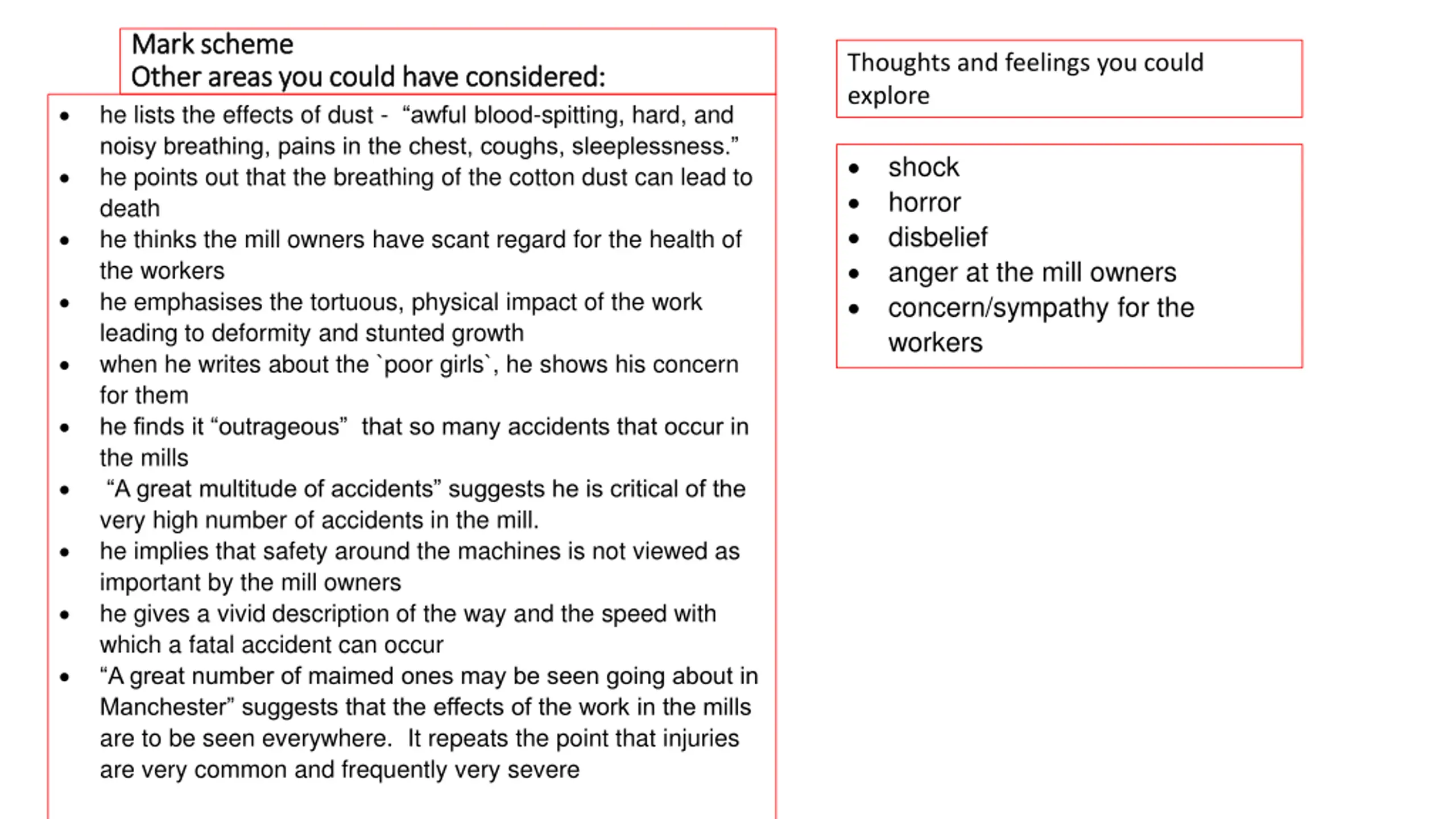 Mark scheme Mark scheme Other areas you could have considered: Other areas you could have considered: he lists the effects of dust - awful blood-spitting, hard, and noisy breathing, pains in the chest, coughs, sleeplessness. he points out that the breathing of the cotton dust can lead to death he thinks the mill owners have scant regard for the health of the workers he emphasises the tortuous, physical impact of the work leading to deformity and stunted growth when he writes about the `poor girls`, he shows his concern for them he finds it outrageous that so many accidents that occur in the mills A great multitude of accidents suggests he is critical of the very high number of accidents in the mill. he implies that safety around the machines is not viewed as important by the mill owners he gives a vivid description of the way and the speed with which a fatal accident can occur A great number of maimed ones may be seen going about in Manchester suggests that the effects of the work in the mills are to be seen everywhere. It repeats the point that injuries are very common and frequently very severe Thoughts and feelings you could explore shock horror disbelief anger at the mill owners concern/sympathy for the workers