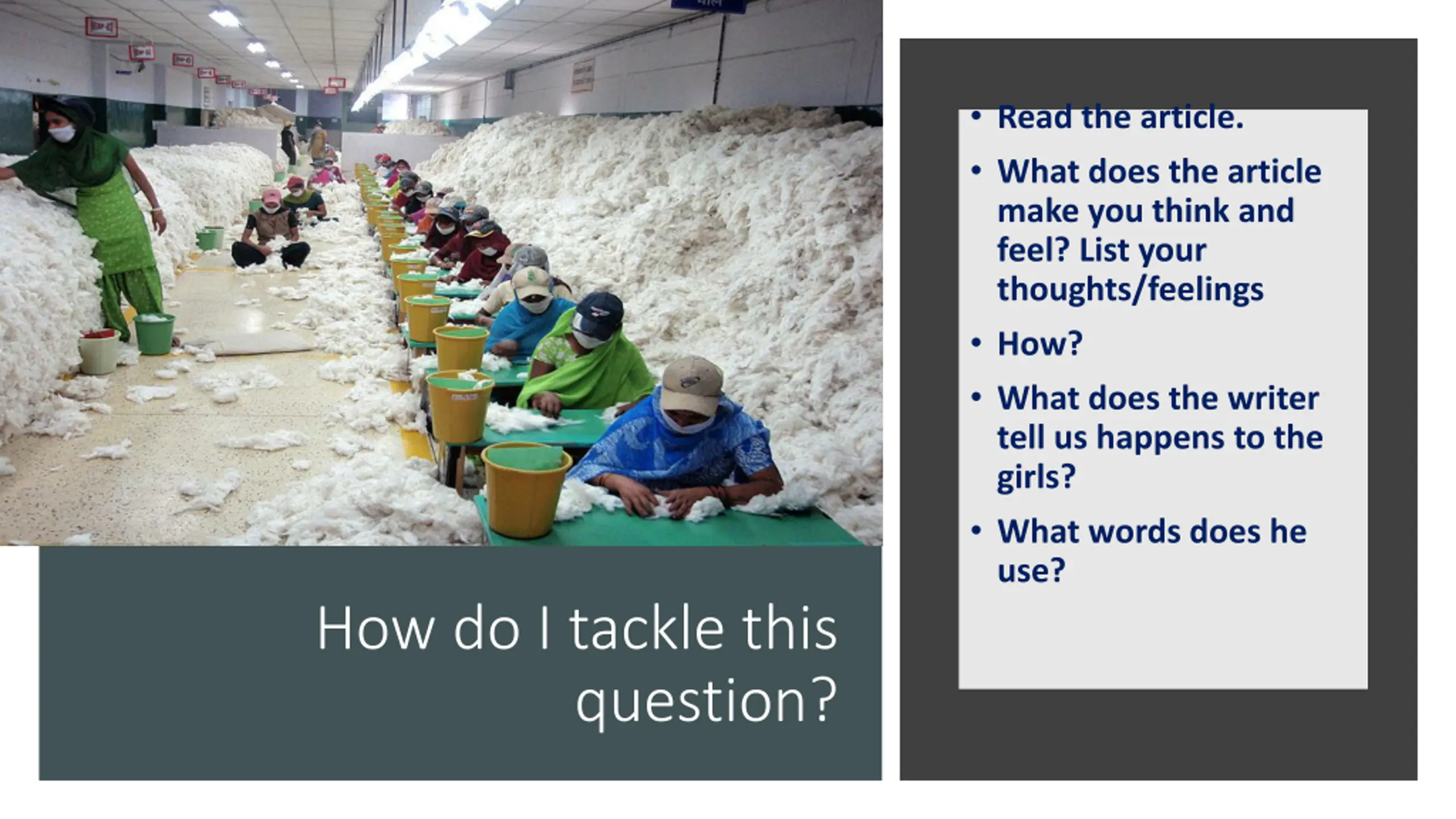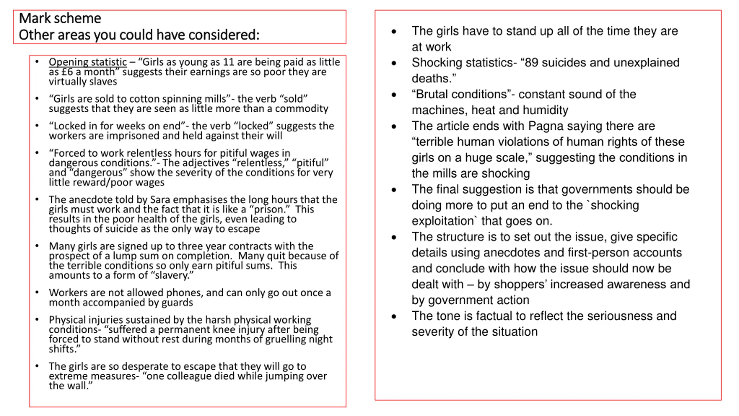 Mark scheme Mark scheme Other areas you could have considered: Other areas you could have considered: The girls have to stand up all of the time they are at work Shocking statistics- 89 suicides and unexplained deaths. Brutal conditions - constant sound of the machines, heat and humidity The article ends with Pagna saying there are terrible human violations of human rights of these girls on a huge scale, suggesting the conditions in the mills are shocking The final suggestion is that governments should be doing more to put an end to the `shocking exploitation` that goes on. The structure is to set out the issue, give specific details using anecdotes and first-person accounts and conclude with how the issue should now be dealt with by shoppers increased awareness and by government action The tone is factual to reflect the seriousness and severity of the situation Opening statistic Girls as young as 11 are being paid as little as 6 a month suggests their earnings are so poor they are virtually slaves Girls are sold to cotton spinning mills - the verb sold suggests that they are seen as little more than a commodity Locked in for weeks on end - the verb locked suggests the workers are imprisoned and held against their will Forced to work relentless hours for pitiful wages in dangerous conditions. - The adjectives relentless, pitiful and dangerous show the severity of the conditions for very little reward/poor wages The anecdote told by Sara emphasises the long hours that the girls must work and the fact that it is like a prison. This results in the poor health of the girls, even leading to thoughts of suicide as the only way to escape Many girls are signed up to three year contracts with the prospect of a lump sum on completion. Many quit because of the terrible conditions so only earn pitiful sums. This amounts to a form of slavery. Workers are not allowed phones, and can only go out once a month accompanied by guards Physical injuries sustained by the harsh physical working conditions- suffered a permanent knee injury after being forced to stand without rest during months of gruelling night shifts. The girls are so desperate to escape that they will go to extreme measures- one colleague died while jumping over the wall.