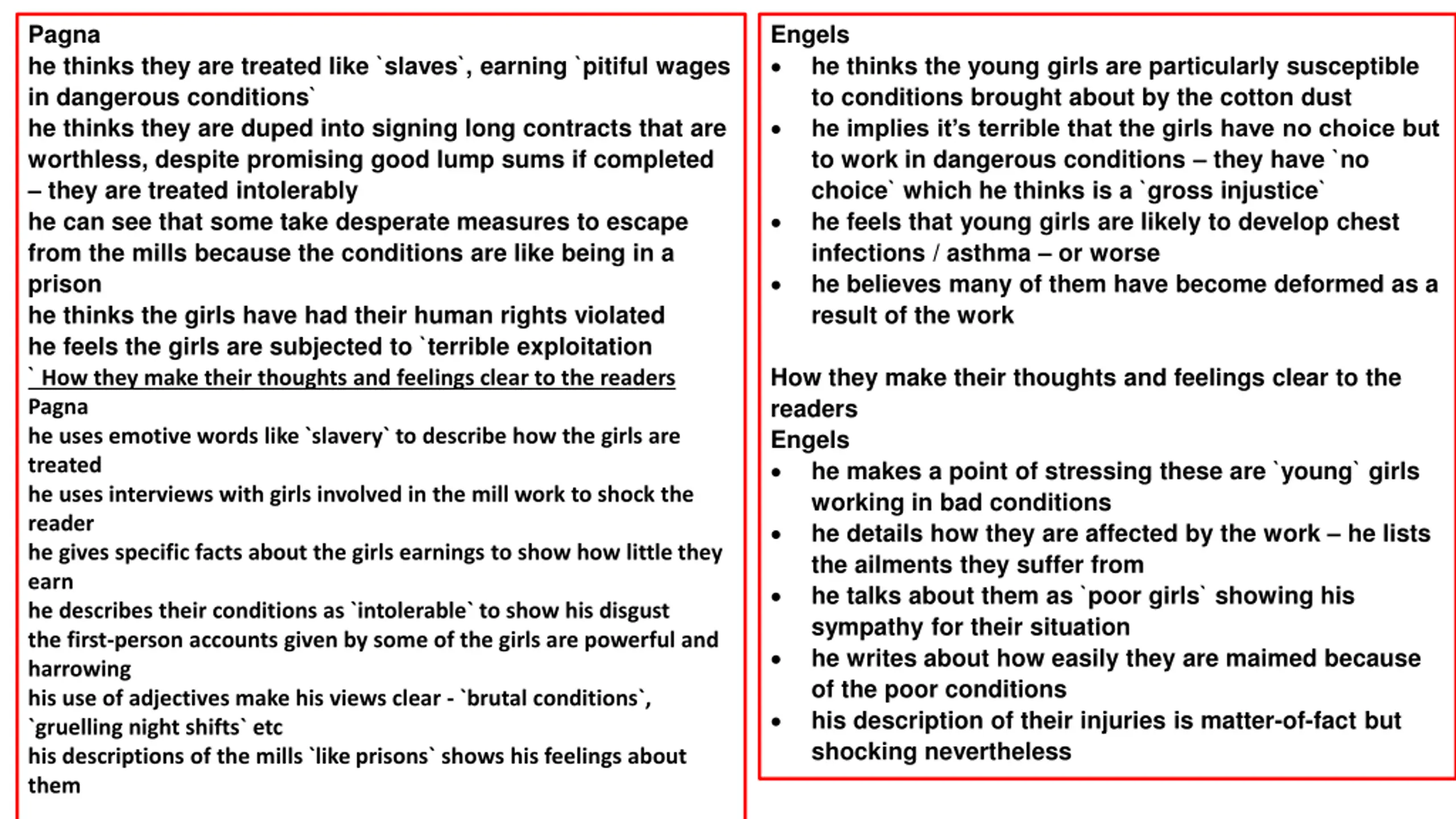 Pagna he thinks they are treated like `slaves`, earning `pitiful wages in dangerous conditions` he thinks they are duped into signing long contracts that are worthless, despite promising good lump sums if completed they are treated intolerably he can see that some take desperate measures to escape from the mills because the conditions are like being in a prison he thinks the girls have had their human rights violated he feels the girls are subjected to `terrible exploitation ` How they make their thoughts and feelings clear to the readers Pagna he uses emotive words like `slavery` to describe how the girls are treated he uses interviews with girls involved in the mill work to shock the reader he gives specific facts about the girls earnings to show how little they earn he describes their conditions as `intolerable` to show his disgust the first-person accounts given by some of the girls are powerful and harrowing his use of adjectives make his views clear - `brutal conditions`, `gruelling night shifts` etc his descriptions of the mills `like prisons` shows his feelings about them Engels he thinks the young girls are particularly susceptible to conditions brought about by the cotton dust he implies it s terrible that the girls have no choice but to work in dangerous conditions they have `no choice` which he thinks is a `gross injustice` he feels that young girls are likely to develop chest infections / asthma or worse he believes many of them have become deformed as a result of the work How they make their thoughts and feelings clear to the readers Engels he makes a point of stressing these are `young` girls working in bad conditions he details how they are affected by the work he lists the ailments they suffer from he talks about them as `poor girls` showing his sympathy for their situation he writes about how easily they are maimed because of the poor conditions his description of their injuries is matter-of-fact but shocking nevertheless