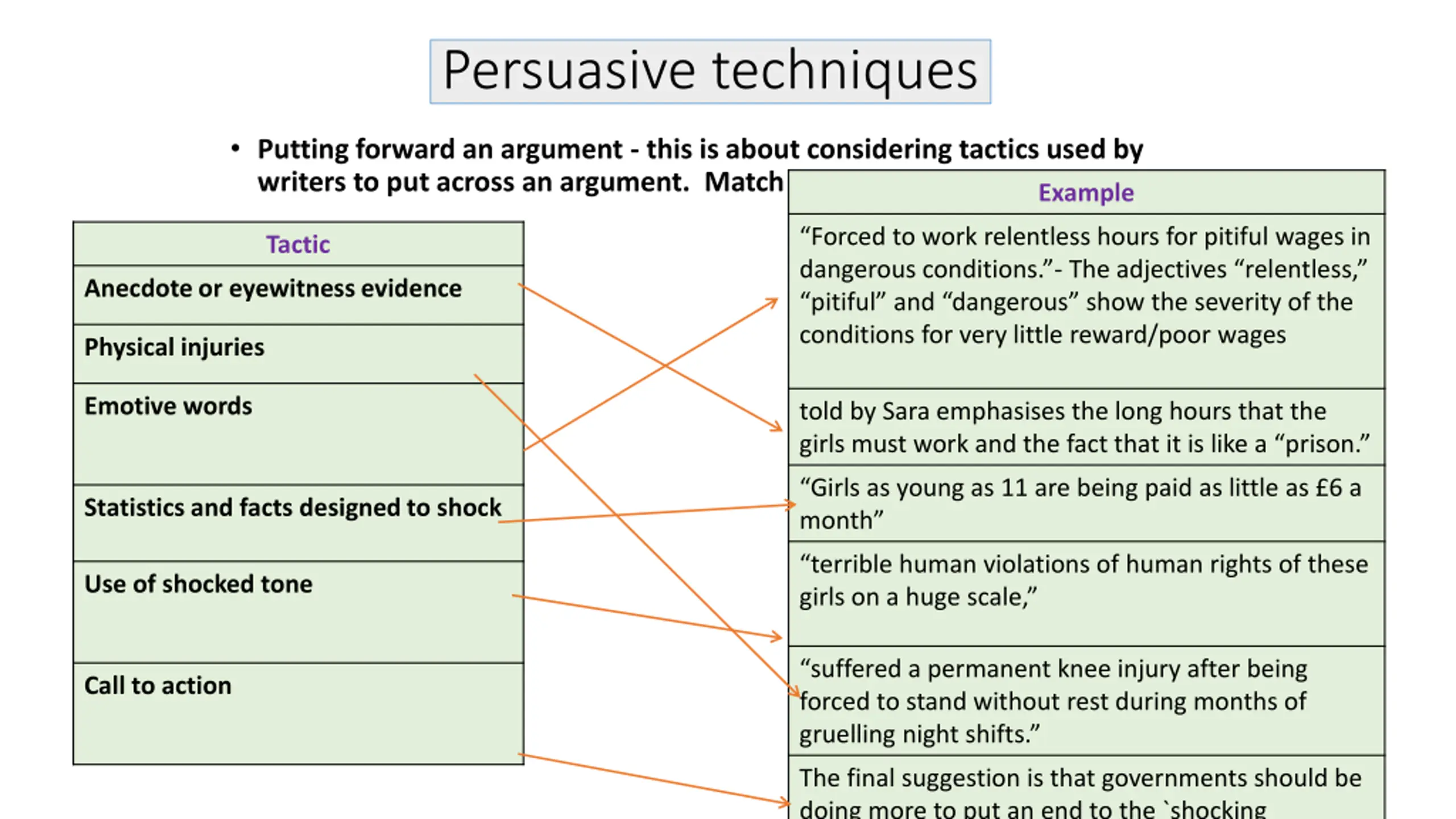 Persuasive techniques Putting forward an argument - this is about considering tactics used by writers to put across an argument. Match the tactic to the example. Example Forced to work relentless hours for pitiful wages in dangerous conditions. - The adjectives relentless, pitiful and dangerous show the severity of the conditions for very little reward/poor wages Tactic Anecdote or eyewitness evidence Physical injuries Emotive words told by Sara emphasises the long hours that the girls must work and the fact that it is like a prison. Girls as young as 11 are being paid as little as 6 a month Statistics and facts designed to shock terrible human violations of human rights of these girls on a huge scale, Use of shocked tone suffered a permanent knee injury after being forced to stand without rest during months of gruelling night shifts. Call to action The final suggestion is that governments should be doing more to put an end to the `shocking