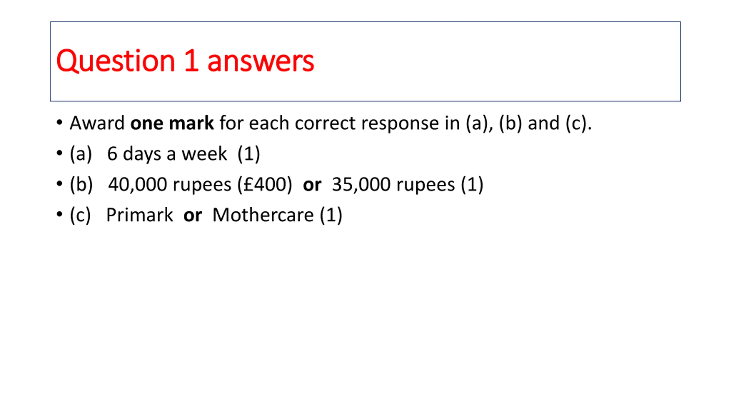 Question 1 answers Question 1 answers Award one mark for each correct response in (a), (b) and (c). (a) 6 days a week (1) (b) 40,000 rupees ( 400) or 35,000 rupees (1) (c) Primark or Mothercare (1)
