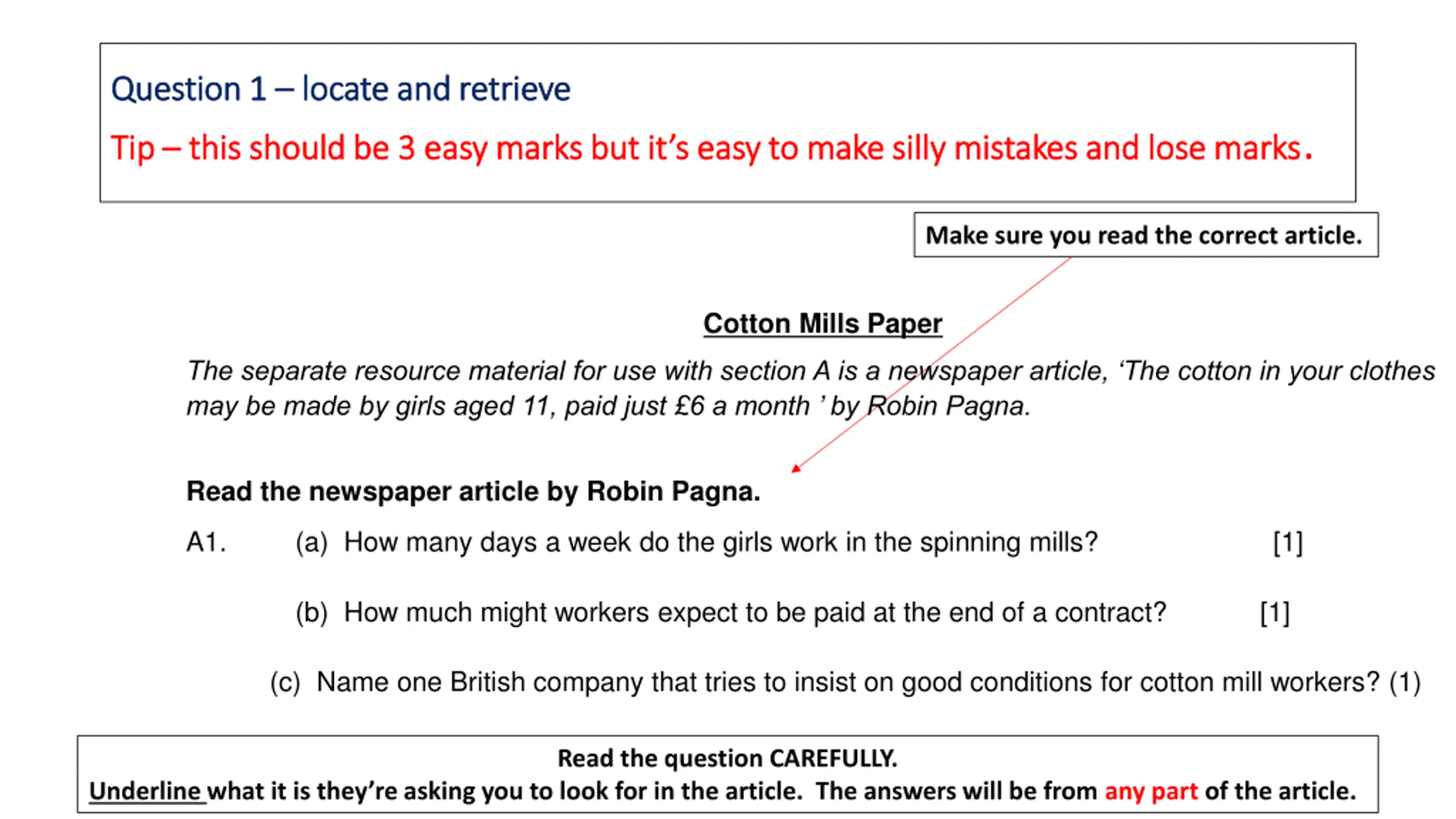 Question 1 Question 1 locate and retrieve locate and retrieve this should be 3 easy marks but it s easy to make silly mistakes and lose marks. Tip Tip this should be 3 easy marks but it s easy to make silly mistakes and lose marks Make sure you read the correct article. Cotton Mills Paper The separate resource material for use with section A is a newspaper article, The cotton in your clothes may be made by girls aged 11, paid just 6 a month by Robin Pagna. Read the newspaper article by Robin Pagna. A1. (c) Name one British company that tries to insist on good conditions for cotton mill workers? (1) (a) How many days a week do the girls work in the spinning mills? [1] (b) How much might workers expect to be paid at the end of a contract? [1] Read the question CAREFULLY. Underline what it is they re asking you to look for in the article. The answers will be from any part of the article.