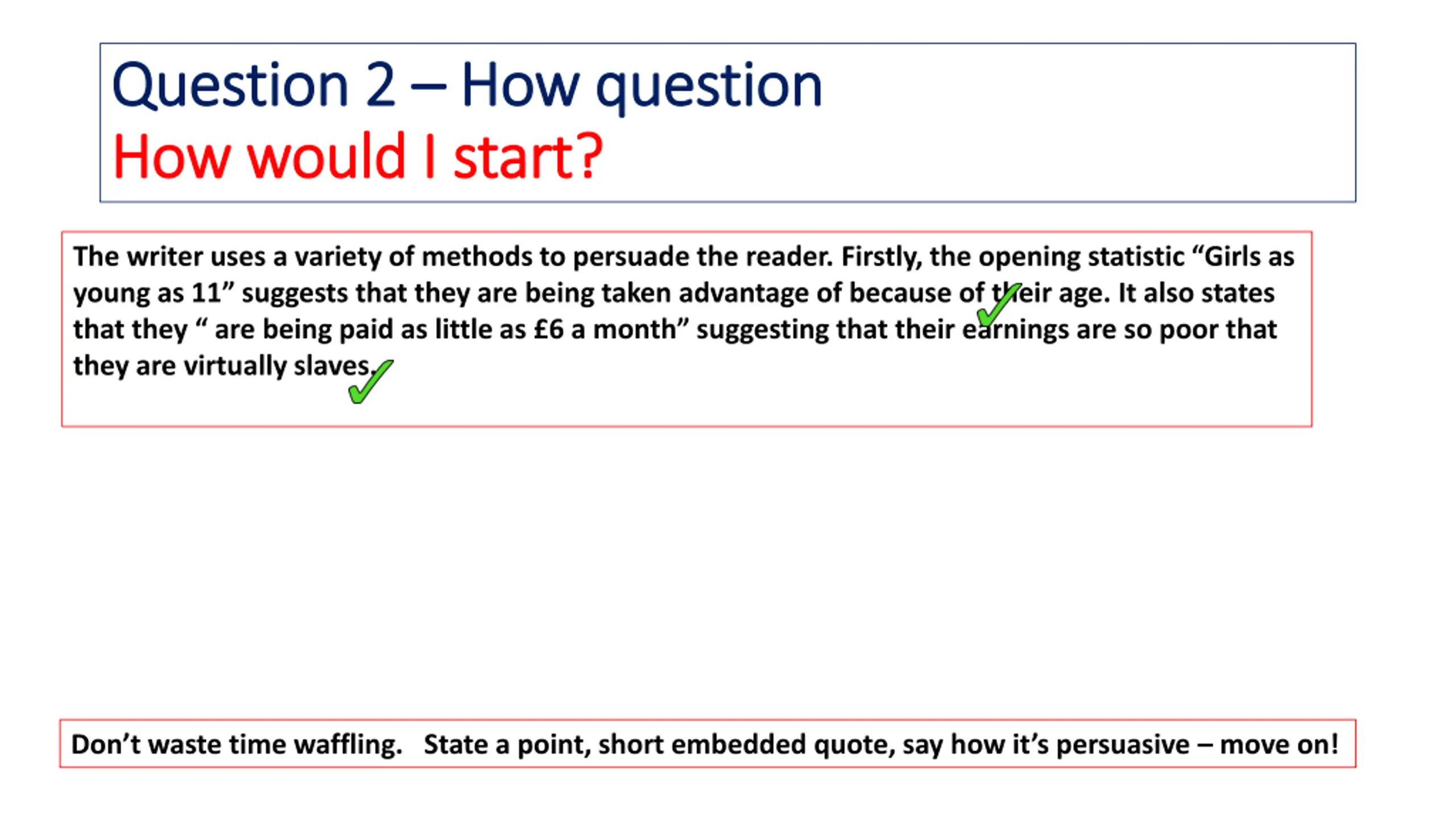 Question 2 Question 2 How question How question How would I start? How would I start? The writer uses a variety of methods to persuade the reader. Firstly, the opening statistic Girls as young as 11 suggests that they are being taken advantage of because of their age. It also states that they are being paid as little as 6 a month suggesting that their earnings are so poor that they are virtually slaves. Don t waste time waffling. State a point, short embedded quote, say how it s persuasive move on!