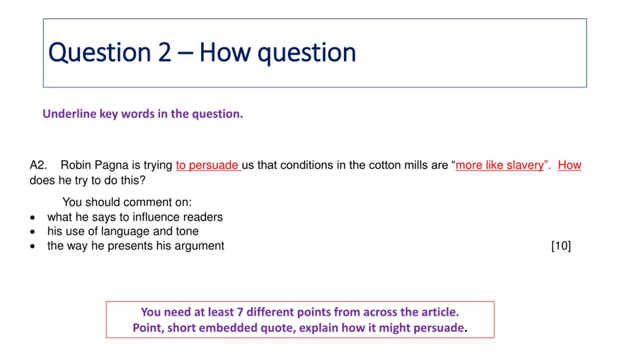 Question 2 Question 2 How question How question Underline key words in the question. A2. Robin Pagna is trying to persuade us that conditions in the cotton mills are more like slavery . How does he try to do this? You should comment on: what he says to influence readers his use of language and tone the way he presents his argument [10] You need at least 7 different points from across the article. Point, short embedded quote, explain how it might persuade.