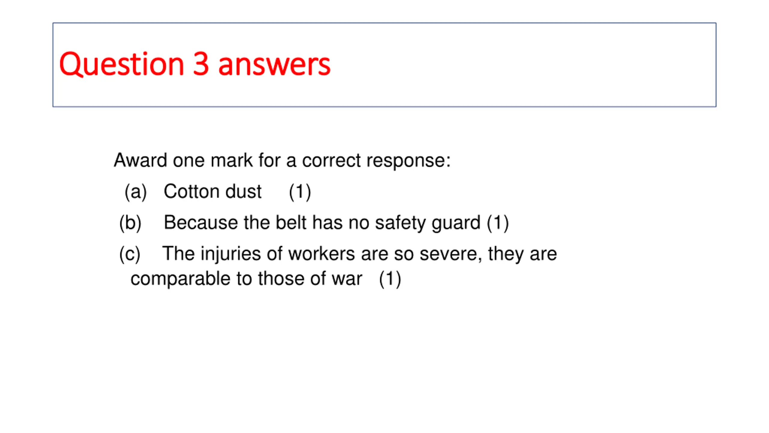 Question 3 answers Question 3 answers Award one mark for a correct response: (a) Cotton dust (1) (b) Because the belt has no safety guard (1) (c) The injuries of workers are so severe, they are comparable to those of war (1)