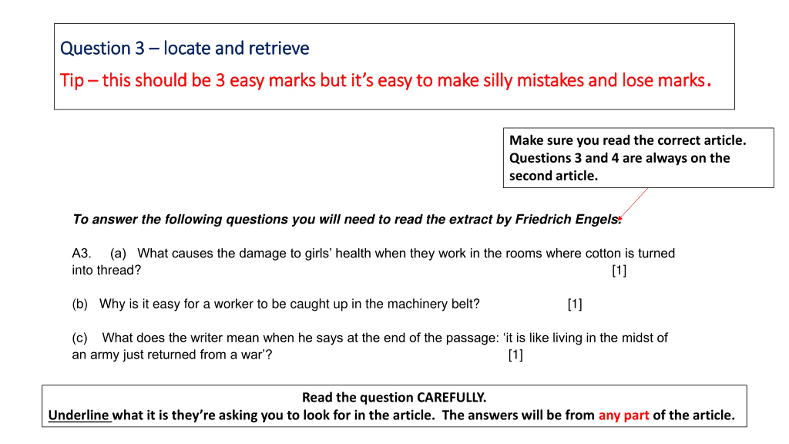 Question 3 Question 3 locate and retrieve locate and retrieve this should be 3 easy marks but it s easy to make silly mistakes and lose marks. Tip Tip this should be 3 easy marks but it s easy to make silly mistakes and lose marks Make sure you read the correct article. Questions 3 and 4 are always on the second article. To answer the following questions you will need to read the extract by Friedrich Engels. A3. (a) What causes the damage to girls health when they work in the rooms where cotton is turned into thread? [1] (b) Why is it easy for a worker to be caught up in the machinery belt? (c) What does the writer mean when he says at the end of the passage: it is like living in the midst of an army just returned from a war ? [1] [1] Read the question CAREFULLY. Underline what it is they re asking you to look for in the article. The answers will be from any part of the article.
