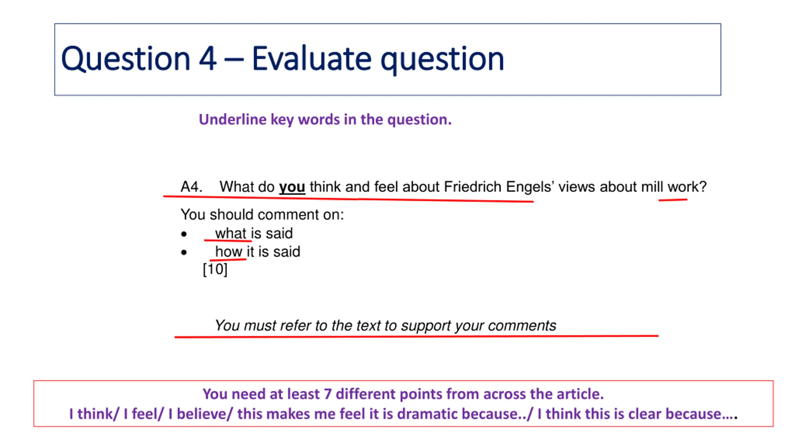 Question 4 Question 4 Evaluate question Evaluate question Underline key words in the question. A4. What do youthink and feel about Friedrich Engels views about mill work? You should comment on: what is said how it is said [10] You must refer to the text to support your comments You need at least 7 different points from across the article. I think/ I feel/ I believe/ this makes me feel it is dramatic because../ I think this is clear because .