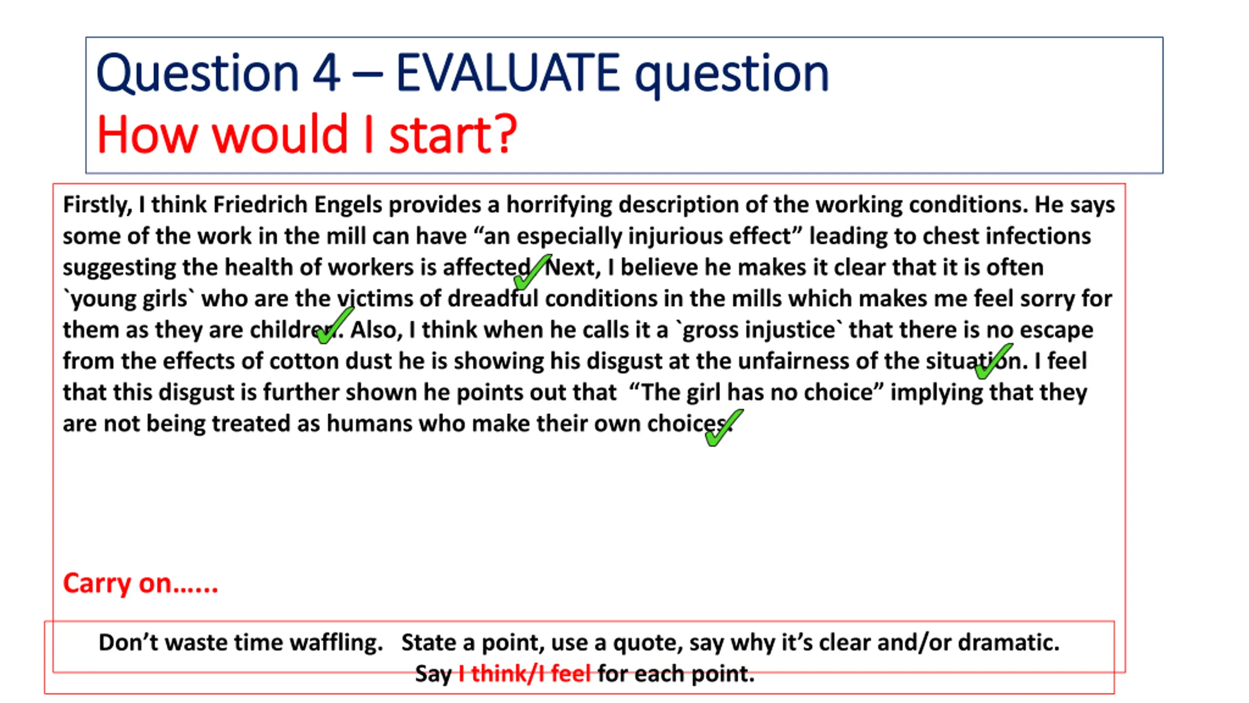 Question 4 Question 4 EVALUATE question EVALUATE question How would I start? How would I start? Firstly, I think Friedrich Engels provides a horrifying description of the working conditions. He says some of the work in the mill can have an especially injurious effect leading to chest infections suggesting the health of workers is affected. Next, I believe he makes it clear that it is often `young girls` who are the victims of dreadful conditions in the mills which makes me feel sorry for them as they are children. Also, I think when he calls it a `gross injustice` that there is no escape from the effects of cotton dust he is showing his disgust at the unfairness of the situation. I feel that this disgust is further shown he points out that The girl has no choice implying that they are not being treated as humans who make their own choices. Carry on ... Don t waste time waffling. State a point, use a quote, say why it s clear and/or dramatic. Say I think/I feel for each point.