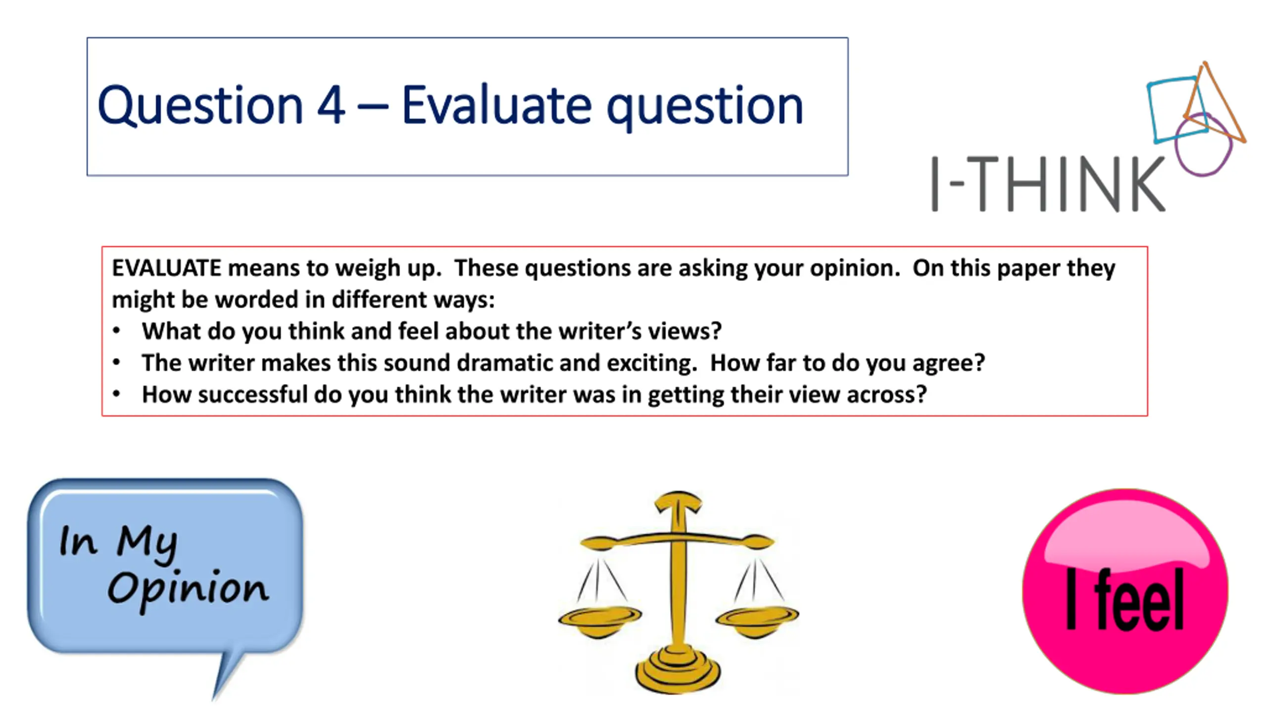 Question 4 Question 4 Evaluate question Evaluate question EVALUATE means to weigh up. These questions are asking your opinion. On this paper they might be worded in different ways: What do you think and feel about the writer s views? The writer makes this sound dramatic and exciting. How far to do you agree? How successful do you think the writer was in getting their view across?