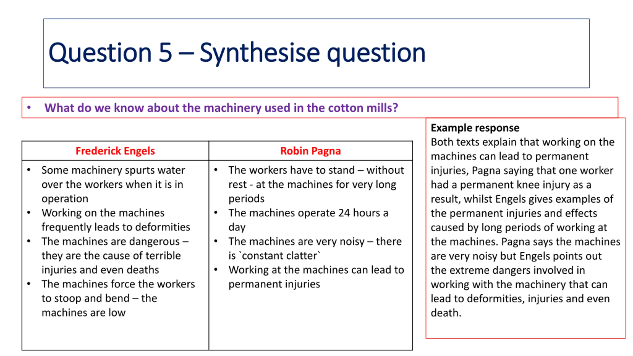 Question 5 Question 5 Synthesise question Synthesise question What do we know about the machinery used in the cotton mills? Example response Both texts explain that working on the machines can lead to permanent injuries, Pagna saying that one worker had a permanent knee injury as a result, whilst Engels gives examples of the permanent injuries and effects caused by long periods of working at the machines. Pagna says the machines are very noisy but Engels points out the extreme dangers involved in working with the machinery that can lead to deformities, injuries and even death. Frederick Engels Robin Pagna Some machinery spurts water over the workers when it is in operation Working on the machines frequently leads to deformities The machines are dangerous they are the cause of terrible injuries and even deaths The machines force the workers to stoop and bend the machines are low The workers have to stand without rest - at the machines for very long periods The machines operate 24 hours a day The machines are very noisy there is `constant clatter` Working at the machines can lead to permanent injuries